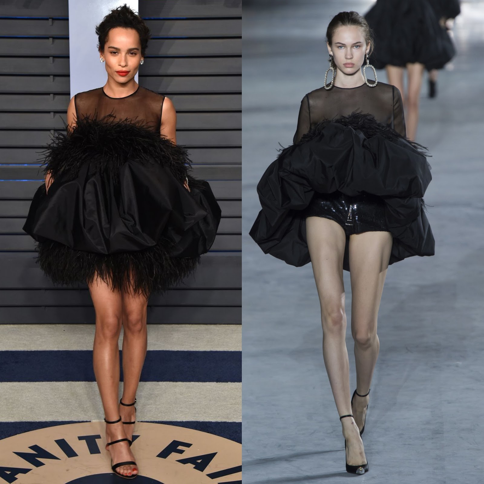Zoey Kravitz in Saint Laurent Spring/Summer 2018--Love, Love and Love! I know some of you might say "OMG! She looks like a puffball!"(I can just hear it now!) But Zoe looks so cute, and so chic in this black mini ensemble from the French fashion house of Saint Laurent and its newly-minted Creative Director Anthony Vaccarello. From the looks of it, it seems that they "customized" it for Kravitz by taking off the sleeves, making the pouf more...pouffy!...as well as adding ostrich feathers at the bottom.