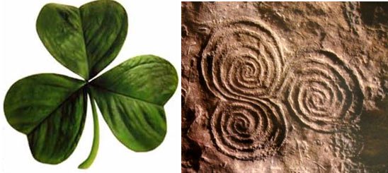 An Irish shamrock on the left, and the triple spiral symbol on the right.
