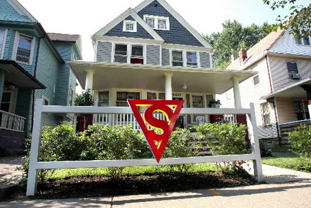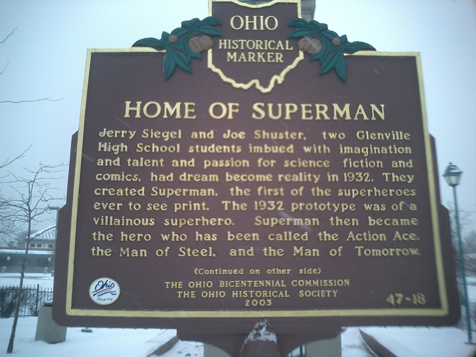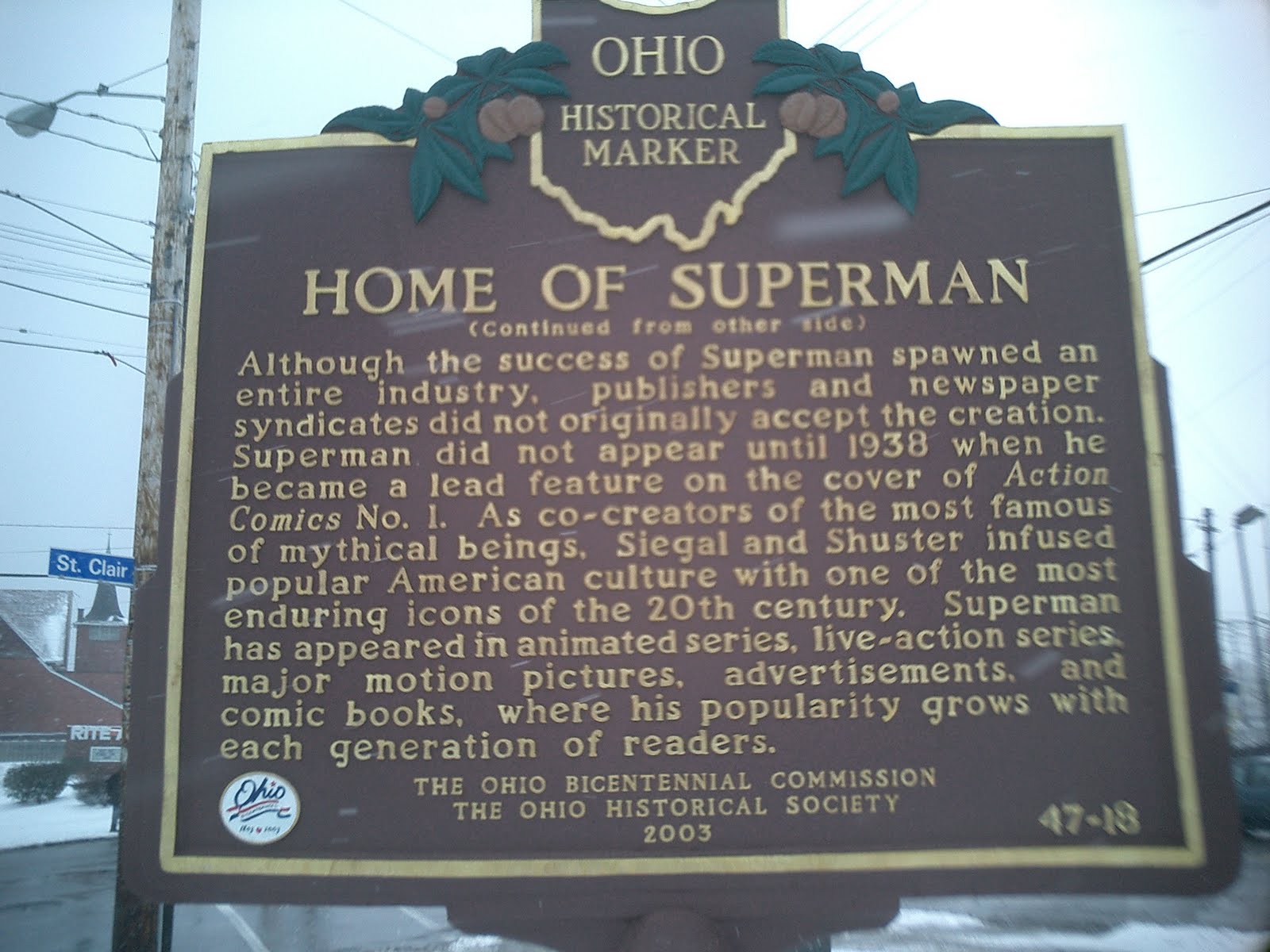 Joe's house: No longer standing. Now an apartment/duplex at corner of Parkwood and Amor with a commemorative Superman fence (displaying a blown-up version of the first Superman story) in front.Ohio Historical Plaque: corner of E. 105 and St. Clair. The first (and, for years, only) official acknowledgment of Siegel and Shuster in Cleveland.