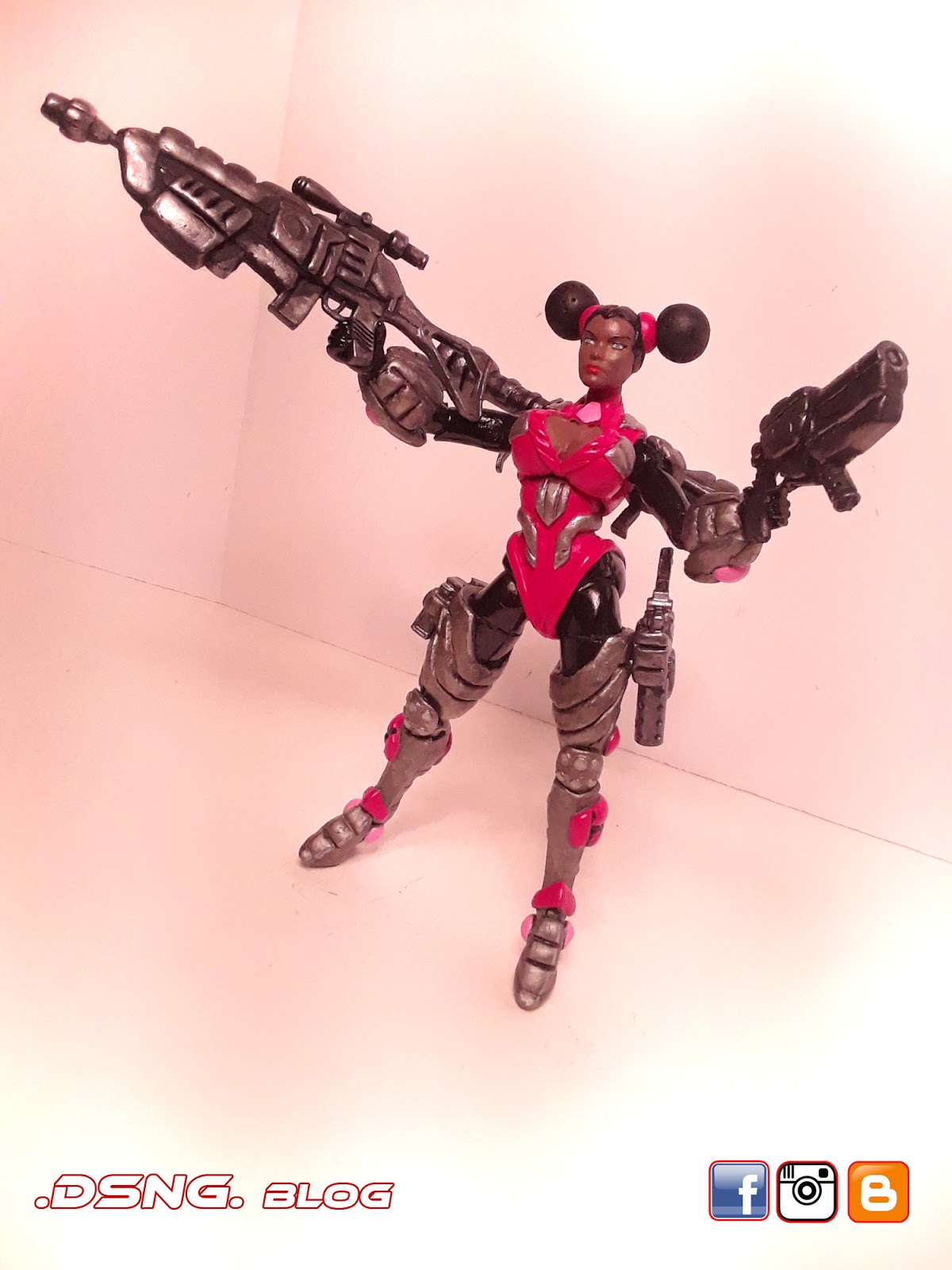 Brief Toy Recipe:The base figure was a mixture of Marvel Legends Enchantress [torso and heels] and MockingBird [top bust and the afro-puff head, which was repainted]. The two sculpted puffs are attached by magnets, so they can be easily removed. And the second helmet-wearing head, featured in the second gallery, came from ML Captain Marvel Carol Danvers. Her legs came from Mockingbird as well. I did a lot of sculpt work on her and eventually gave her four guns. There is a magnet concealed on her left hip, and another magnet on her back, to help with the weapon storage. Tamiya and Vallejo paints were used, and she was hand painted.