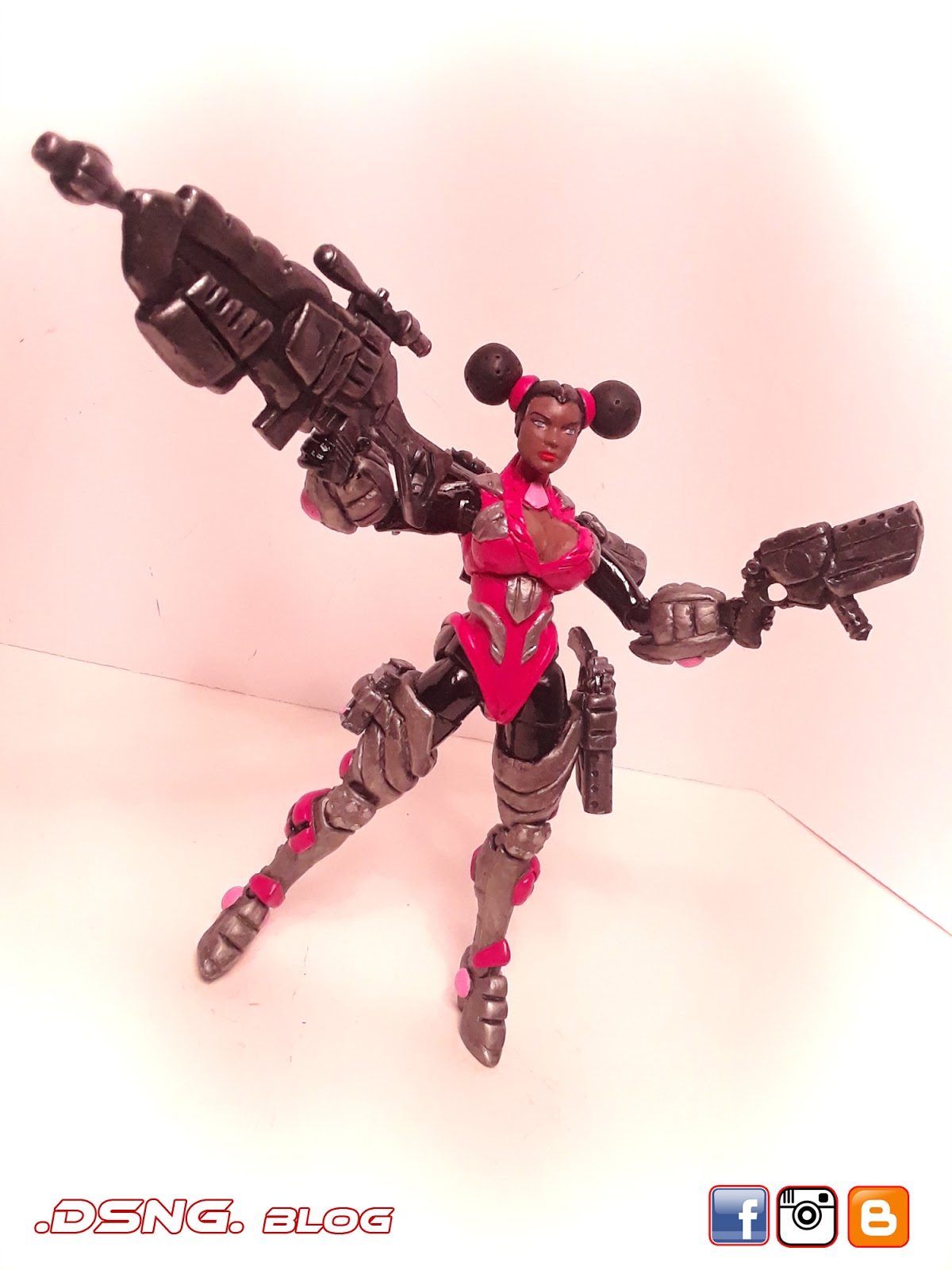 Brief Toy Recipe:The base figure was a mixture of Marvel Legends Enchantress [torso and heels] and MockingBird [top bust and the afro-puff head, which was repainted]. The two sculpted puffs are attached by magnets, so they can be easily removed. And the second helmet-wearing head, featured in the second gallery, came from ML Captain Marvel Carol Danvers. Her legs came from Mockingbird as well. I did a lot of sculpt work on her and eventually gave her four guns. There is a magnet concealed on her left hip, and another magnet on her back, to help with the weapon storage. Tamiya and Vallejo paints were used, and she was hand painted.