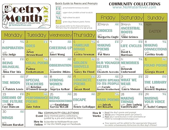 Over at No Water River, the multi-talented poet, teacher, editor, actor, Renée LaTulippe will begin her celebration of poets and poetry at the end of March–March 30th, with Young People’s Poet Laureate, Margarita Engle. Each day after that, for the entire month of April, another poet will share a poem and a writing prompt.