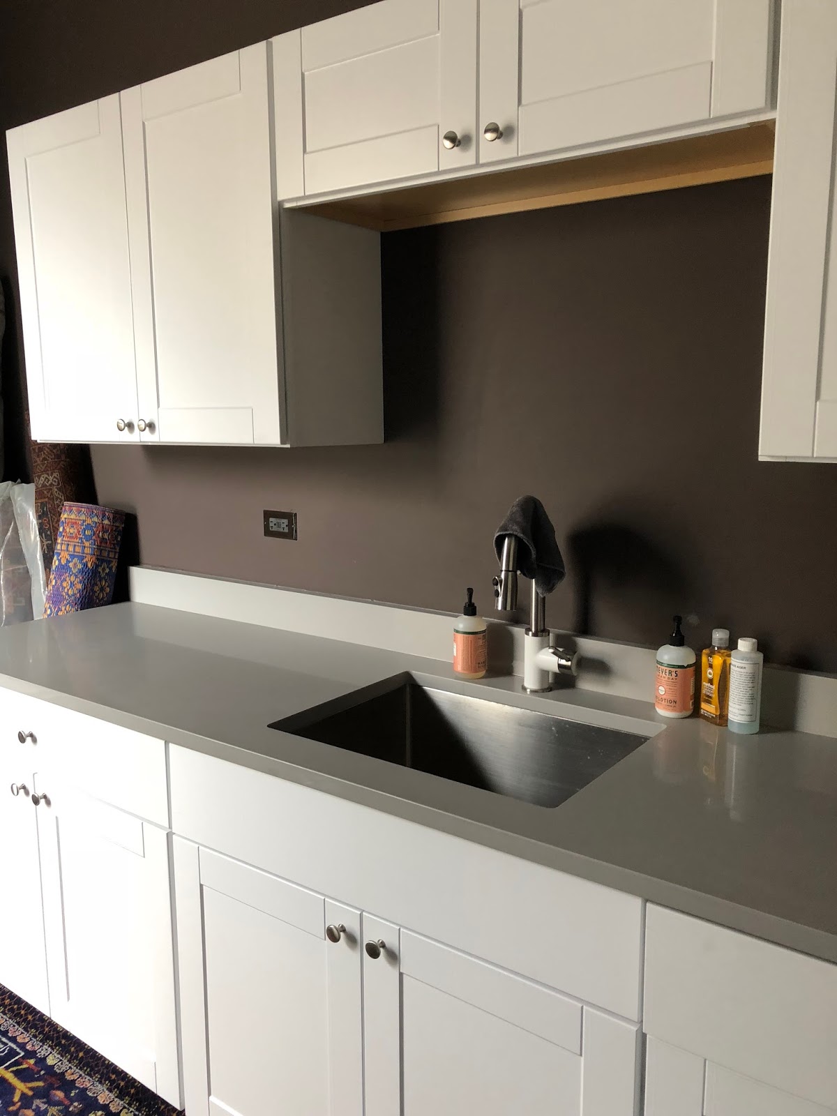 This is the laundry room. As a place devoted to an annoying and endless bit of life maintenance, it is bright and comfy and has a lot of storage.