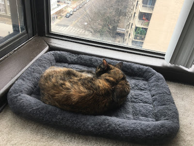 When I used to take photos of magazines and books in our old place, the place we moved from in January, I could take advantage of the pretty walnut of my grandmother's dining table, or the clean bamboo finish of our rented floor. Now that dining table is my husband's desk, and my floor option is a more pedestrian carpet. But the apartment that carpet belongs to is rent-controlled, and capacious enough to welcome a family for dinner on the fly. If you were coming through town and desperate for a couch (er, a floor) to crash on, the carpet of my studio could do the job. This creature is making herself at home at my feet right now~