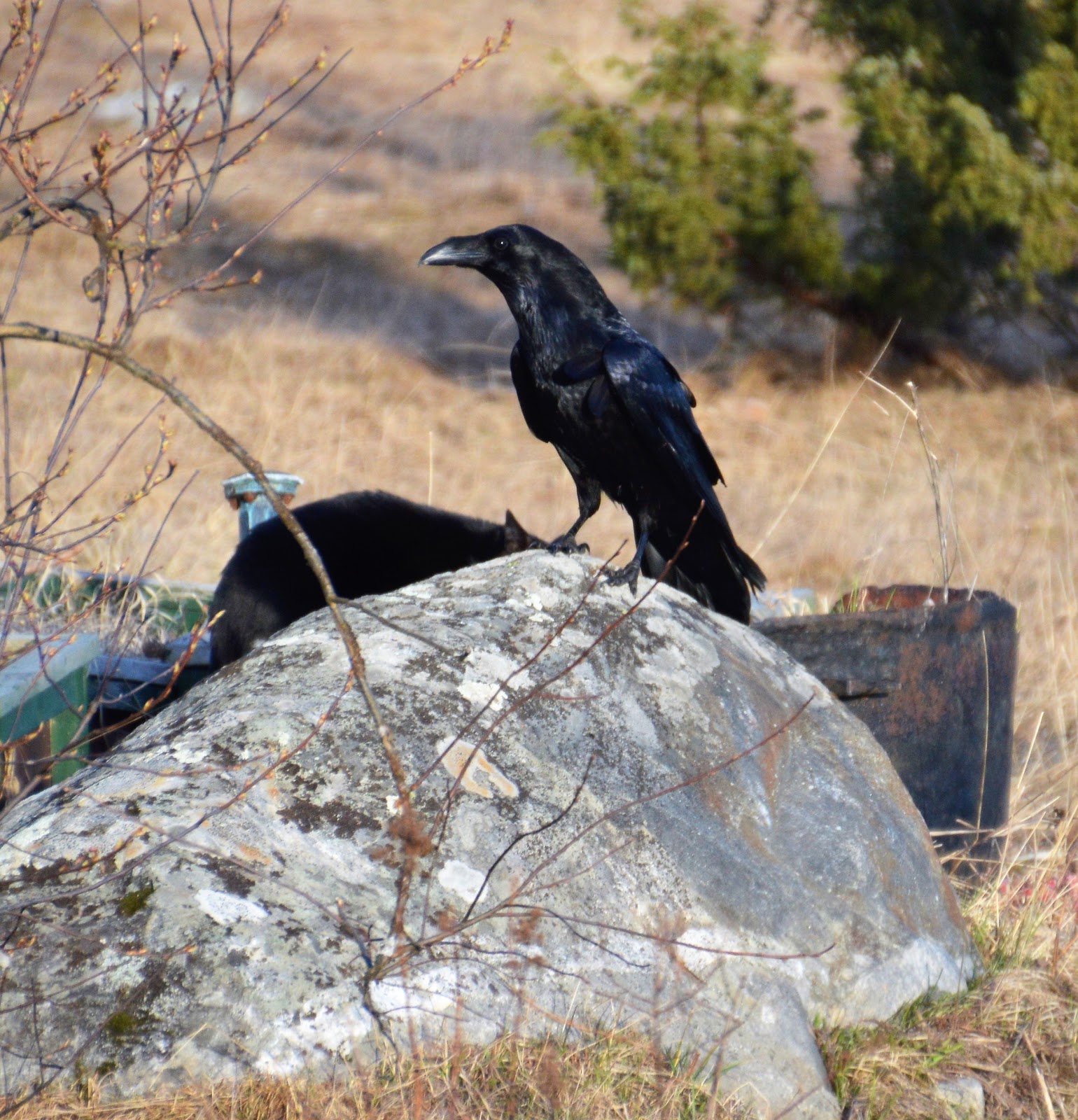 Jag saknar dem faktiskt. Tycker det är lite trist att de lever sitt eget liv nu, utan min inblandning. Det var kul när först bara Korp, och sedan även honan hängde här nästan för jämnan, och var de inte på plats kunde jag bara ropa mot skogen så kom de flygande. "Korp! Korp! Kom då korparna!"Och de tog hit sin första kull med fyra ungar när de lärt sig flyga. De satt här i träden vid vårt hus och pratade, nästan helt orädda, och en av ungarna följde med mig när jag donade kring växthuset.