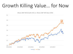 A dollar invested in in the S&P 500 Growth ETF in April of 2013 would be worth $1.86 today. That same dollar invested in the S&P 500 Value ETF would be worth only $1.48 today.