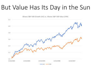 As a case in point, consider the four and a half years corresponding with the bottoming of the tech bust in early 2003 and the pre-meltdown top in 2007. You would have doubled your money in value stocks but only made 63% in growth stocks.