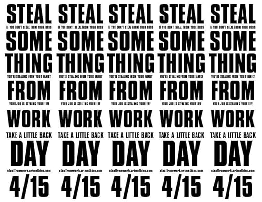 It’s that time of year again! For years, employees around the world have celebrated April 15 as Steal Something from Work Day, a day to even the scales with those who profit on our labor. This year, April 15 falls on a Sunday, which means employers should have nothing to fear—since for thousands of years, Sunday has been designated as a day of rest on which no one should have to work. Didn’t we win the struggle for the 40-hour work week? However, just in case the ever-increasing precarity of the labor market has forced some poor soul to work on Sunday, we’ve prepared a great deal of outreach material celebrating Steal Something from Work Day.
