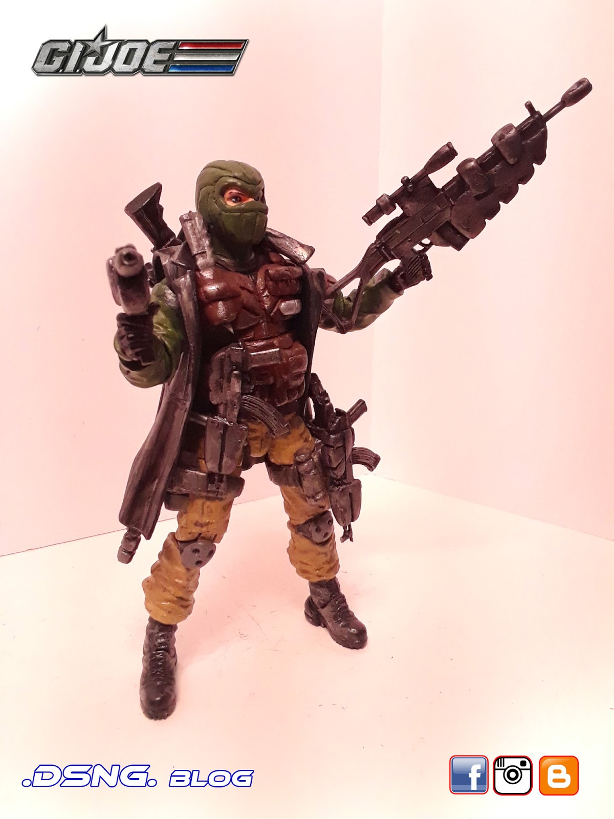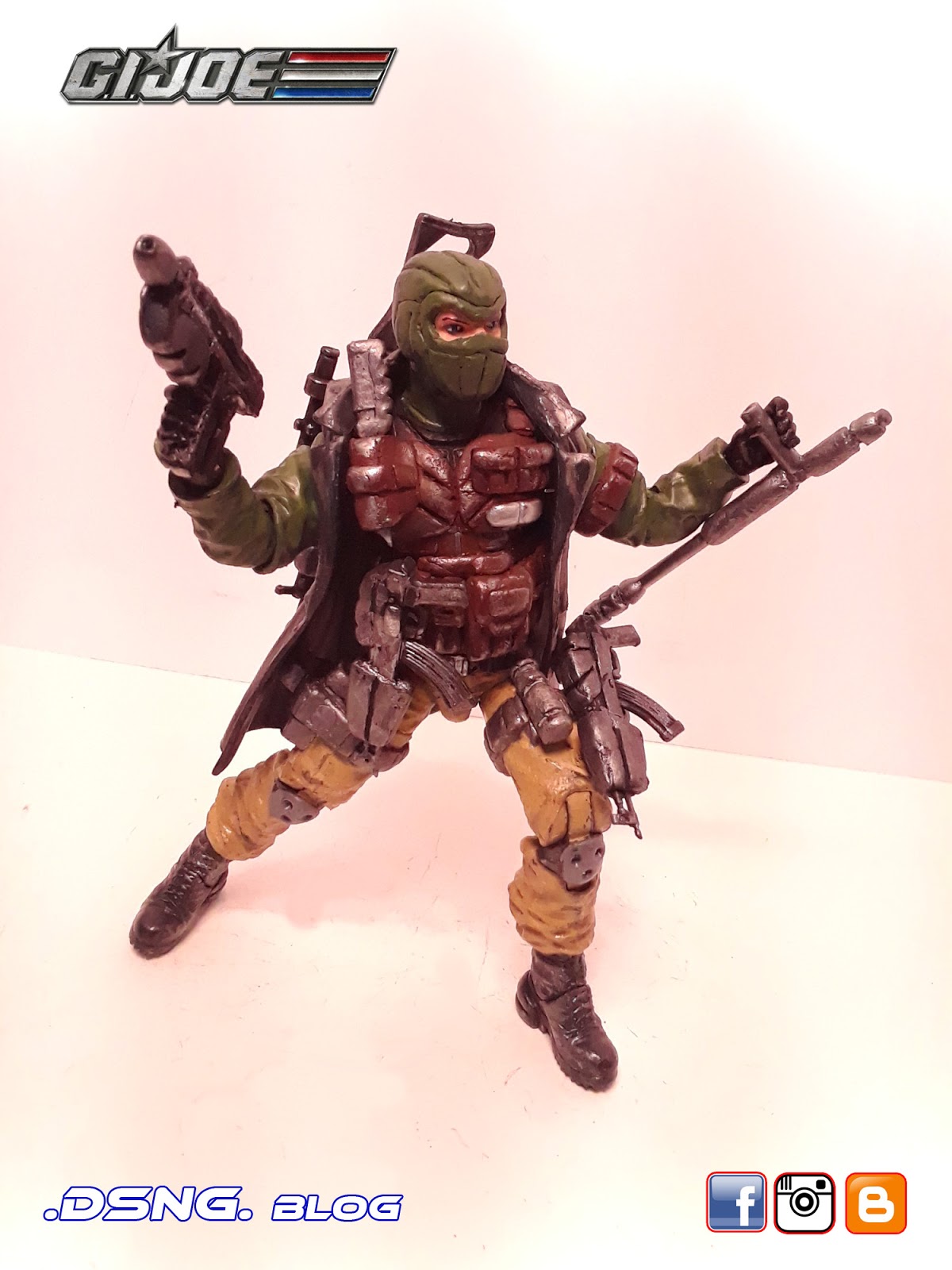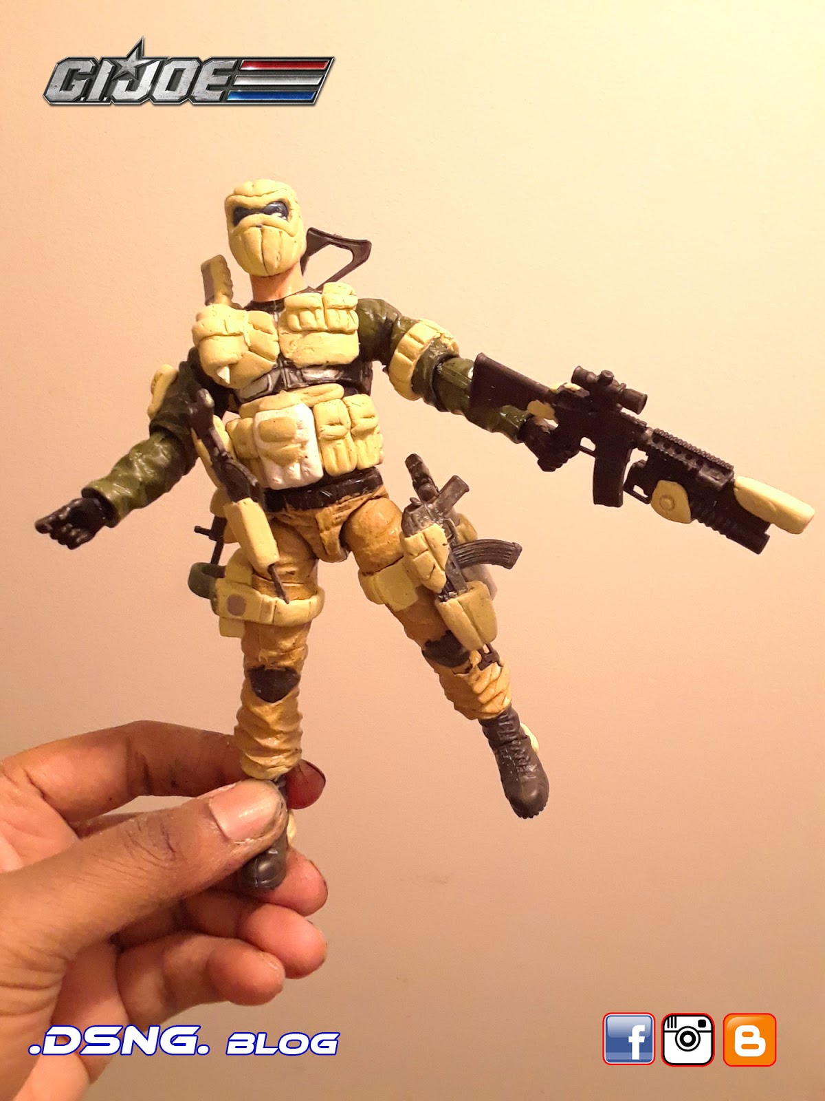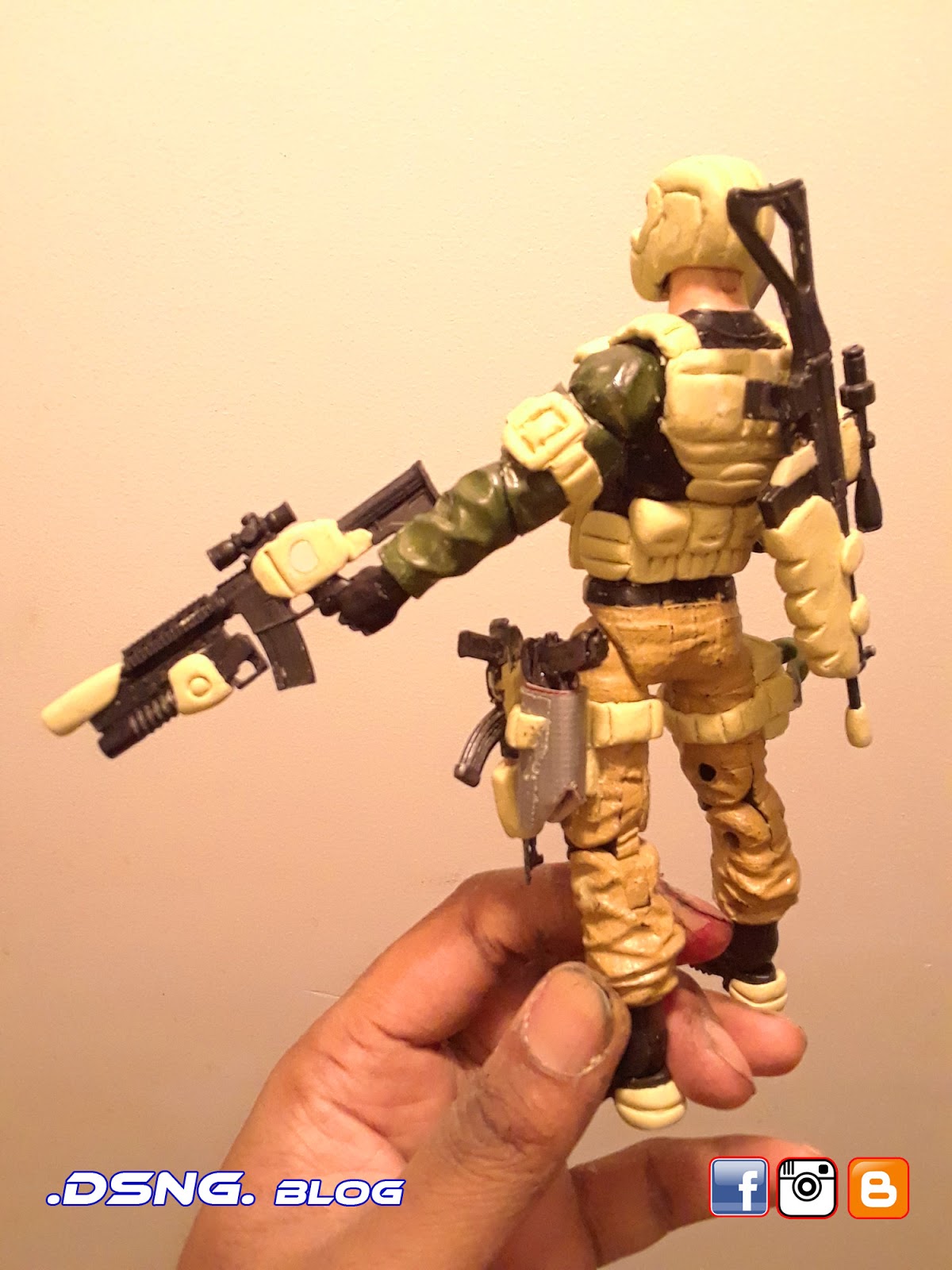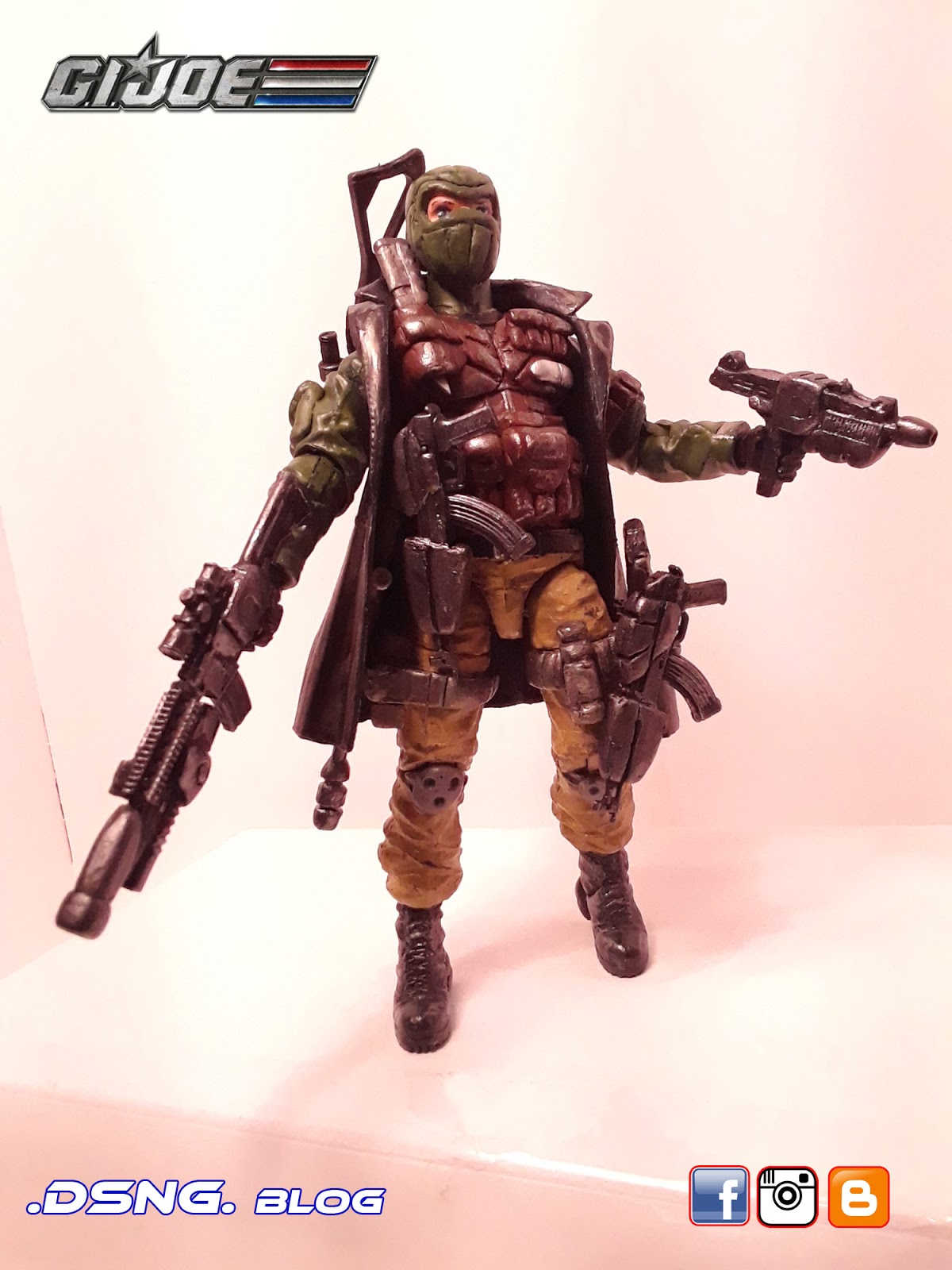 I heavily modified his guns, after buying them on ebay. And the jacket came from Punisher. And some of his guns have magnets that keep them in position. I did sculpt the rear pouches on his back [take a look at the putty / sculpting pics below]. Yet I decided to add the jacket, since it seemed to work with the character... it just gave him more swag LOL. Tamiya paints were used, and he was hand painted. My custom Snake Eyes was added to the mix, and his former gallery is over