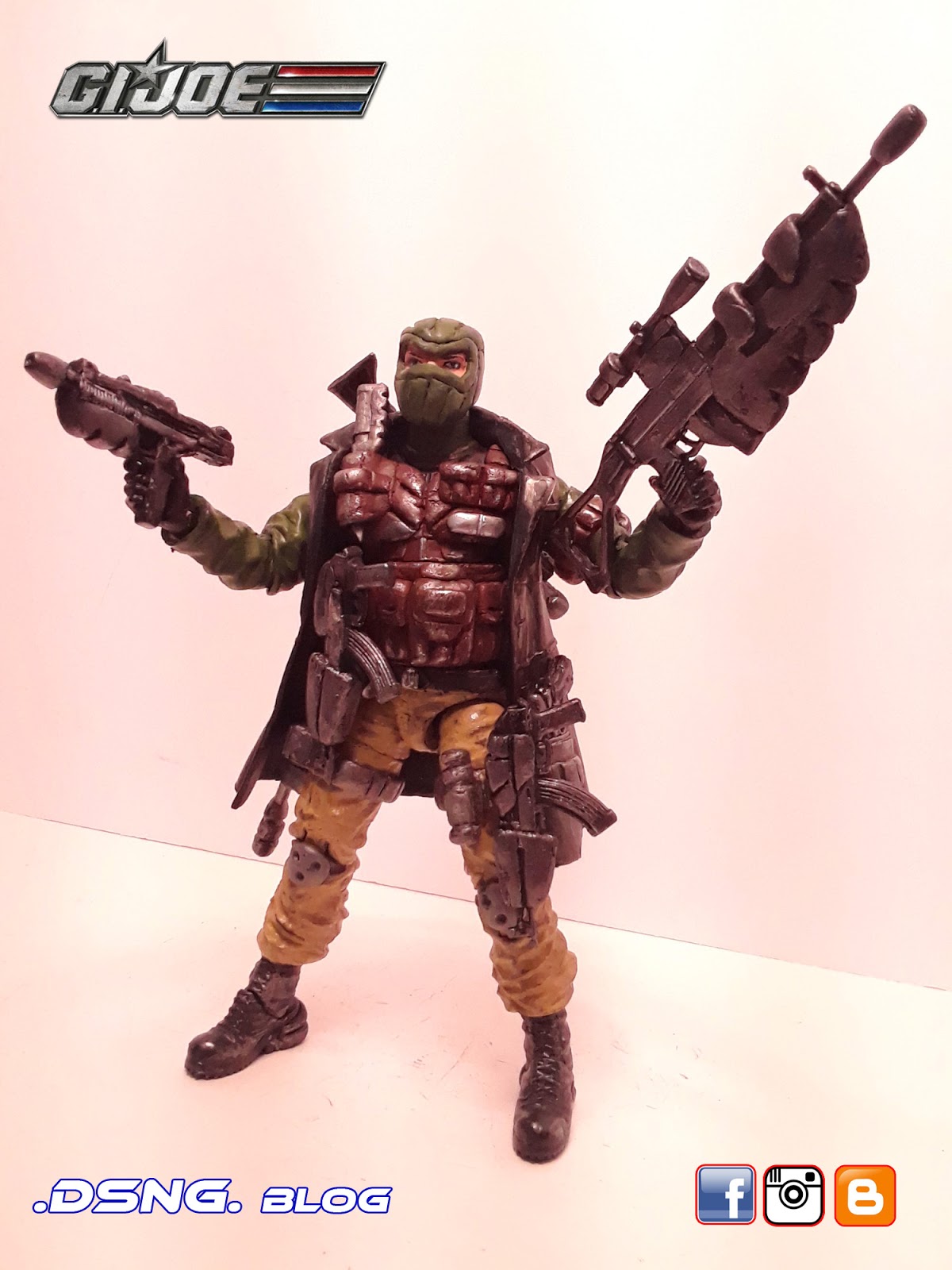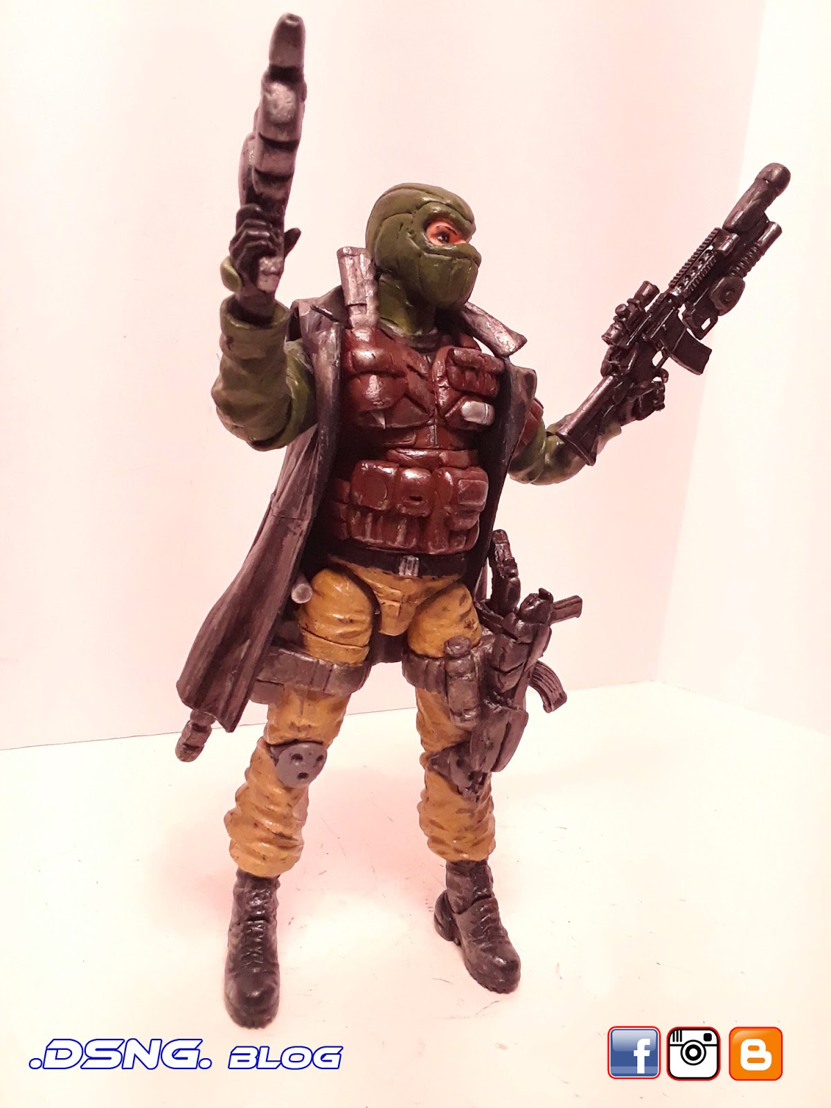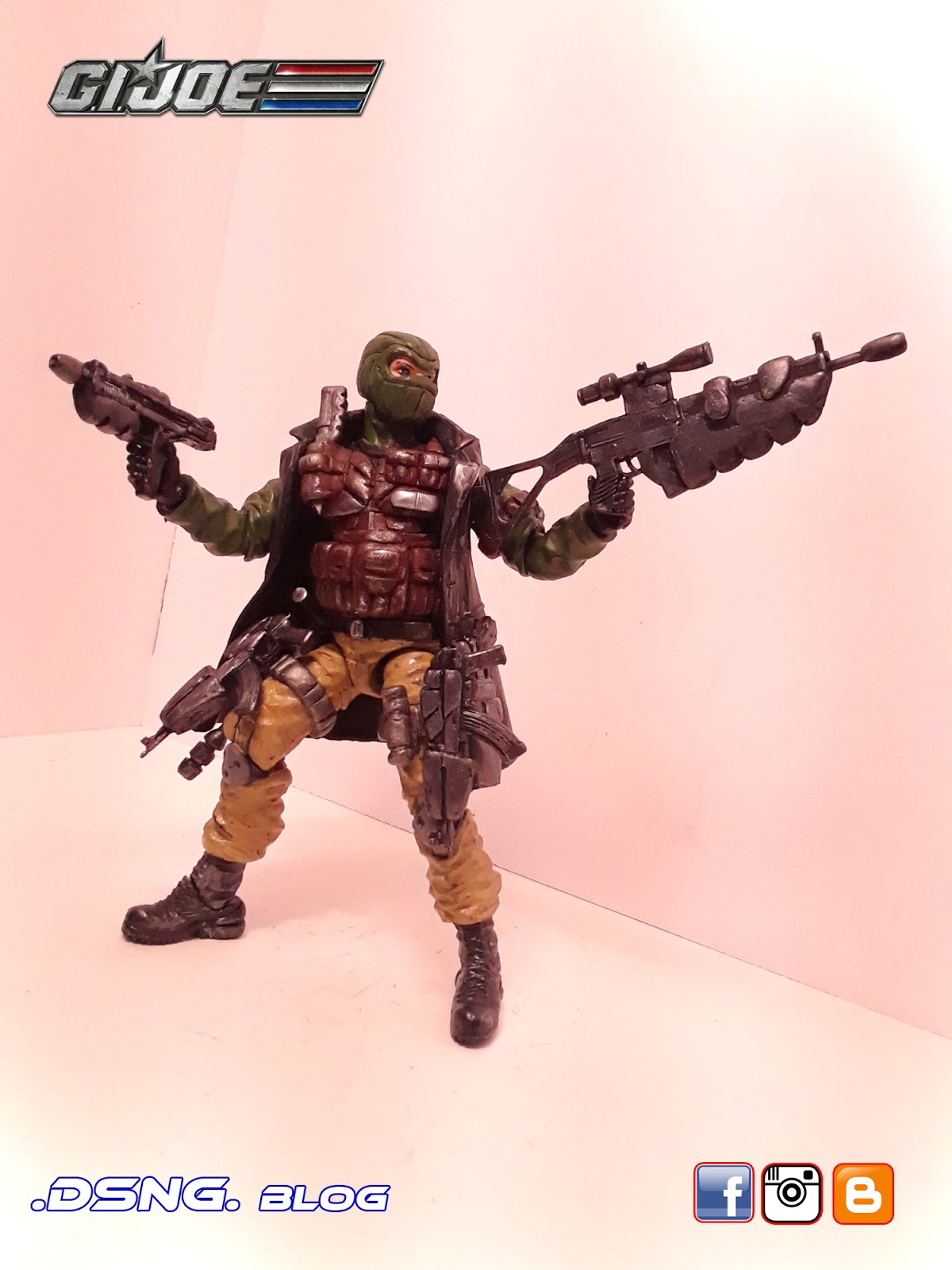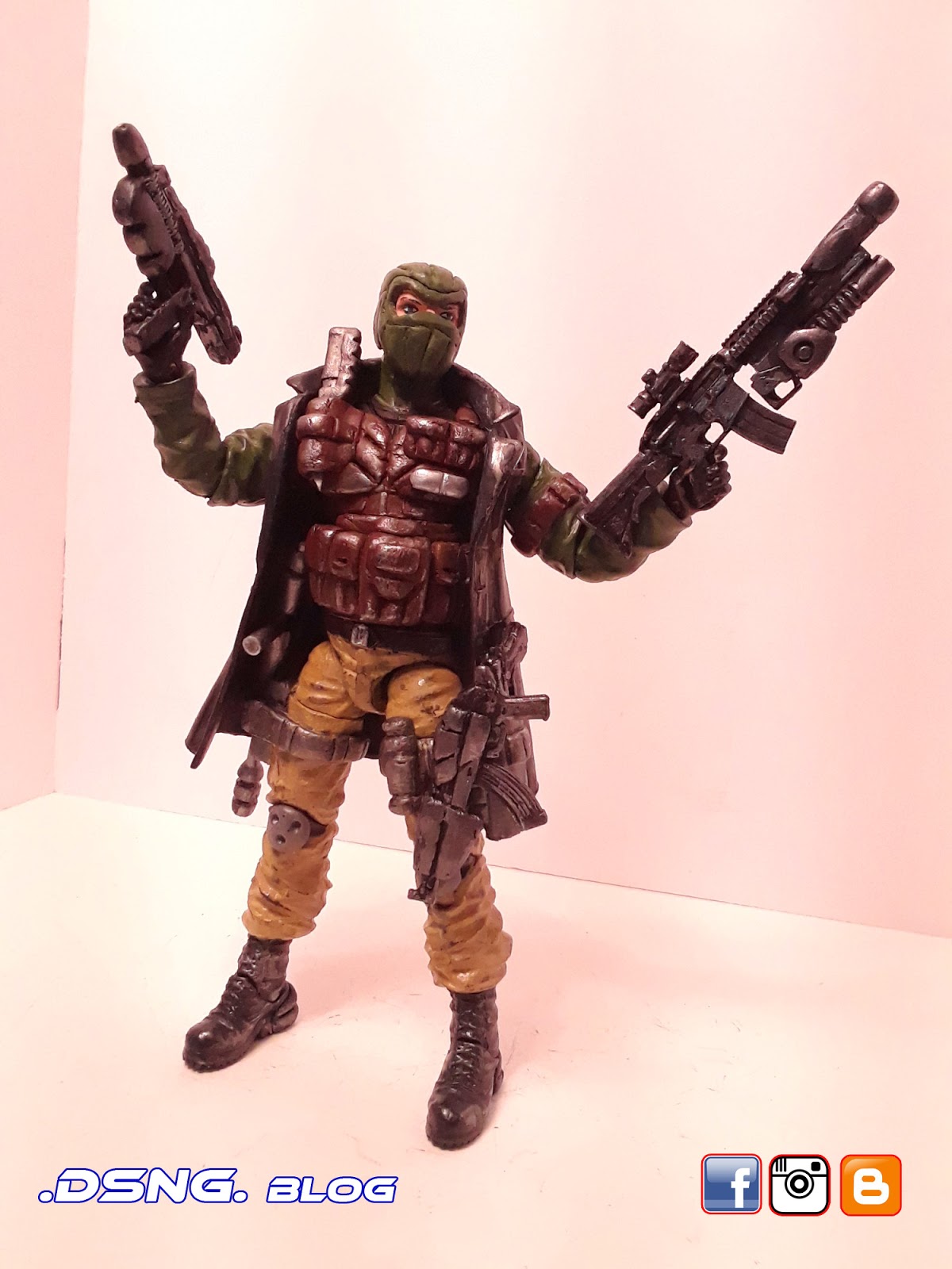 I heavily modified his guns, after buying them on ebay. And the jacket came from Punisher. And some of his guns have magnets that keep them in position. I did sculpt the rear pouches on his back [take a look at the putty / sculpting pics below]. Yet I decided to add the jacket, since it seemed to work with the character... it just gave him more swag LOL. Tamiya paints were used, and he was hand painted. My custom Snake Eyes was added to the mix, and his former gallery is over