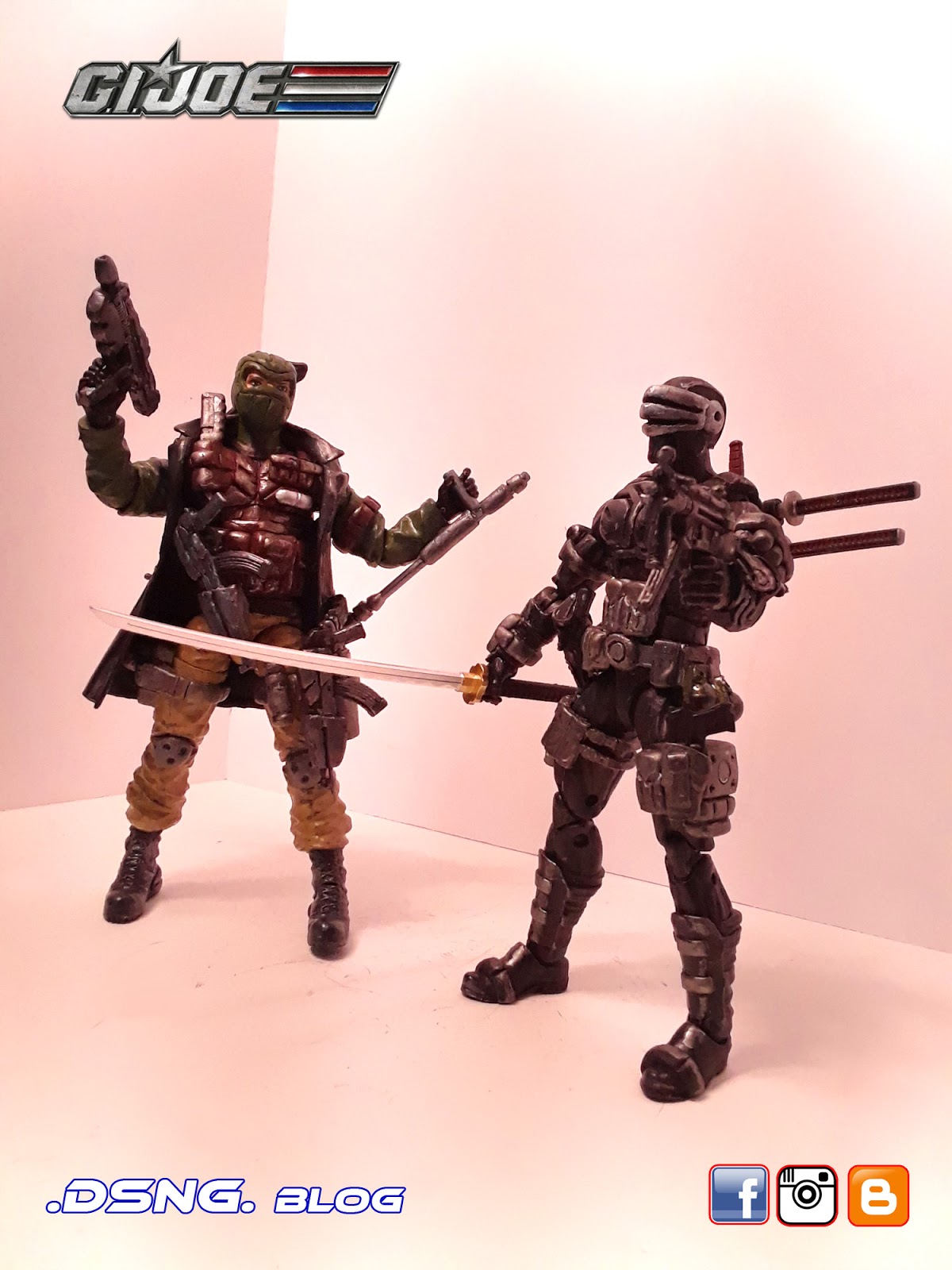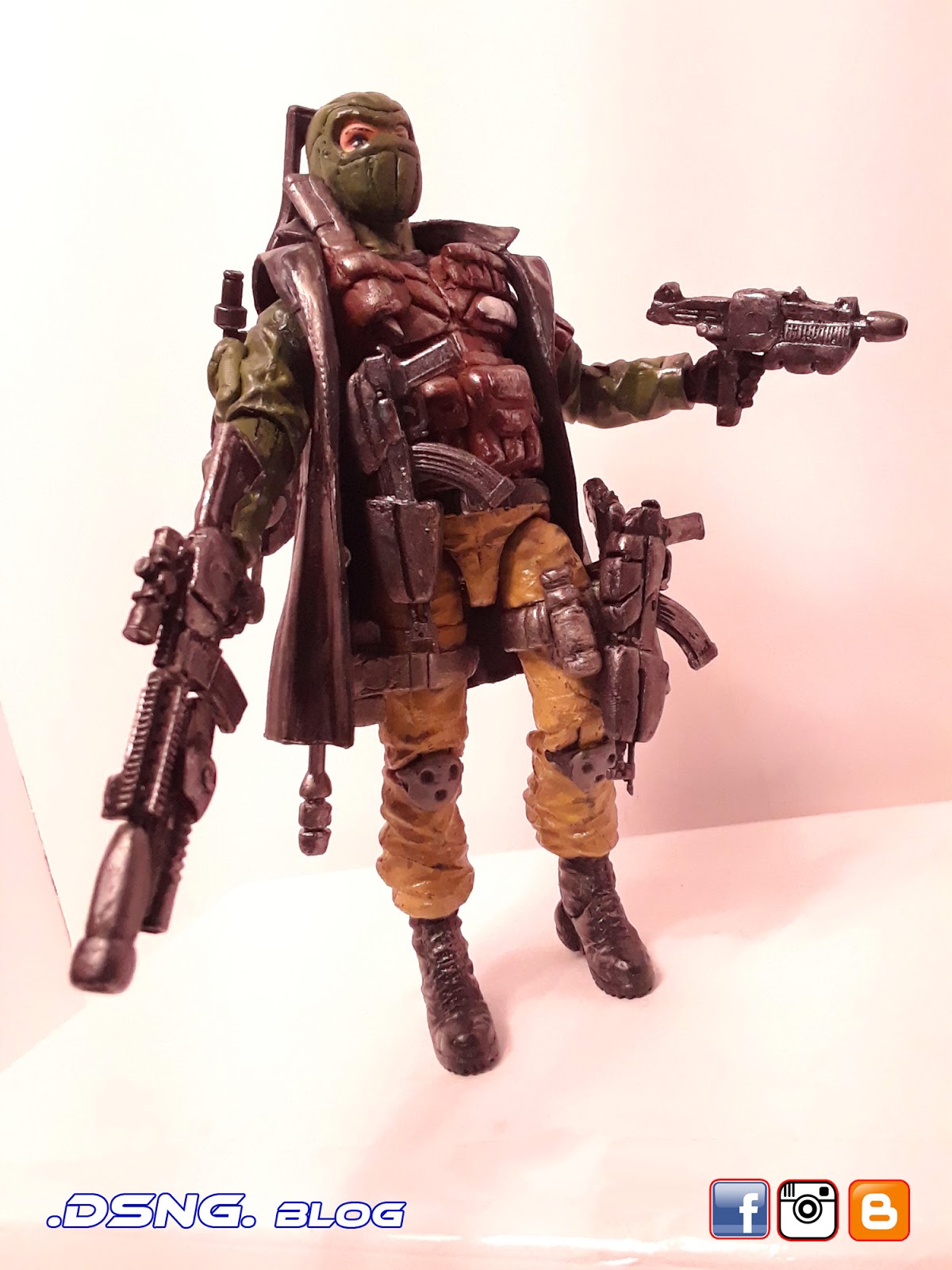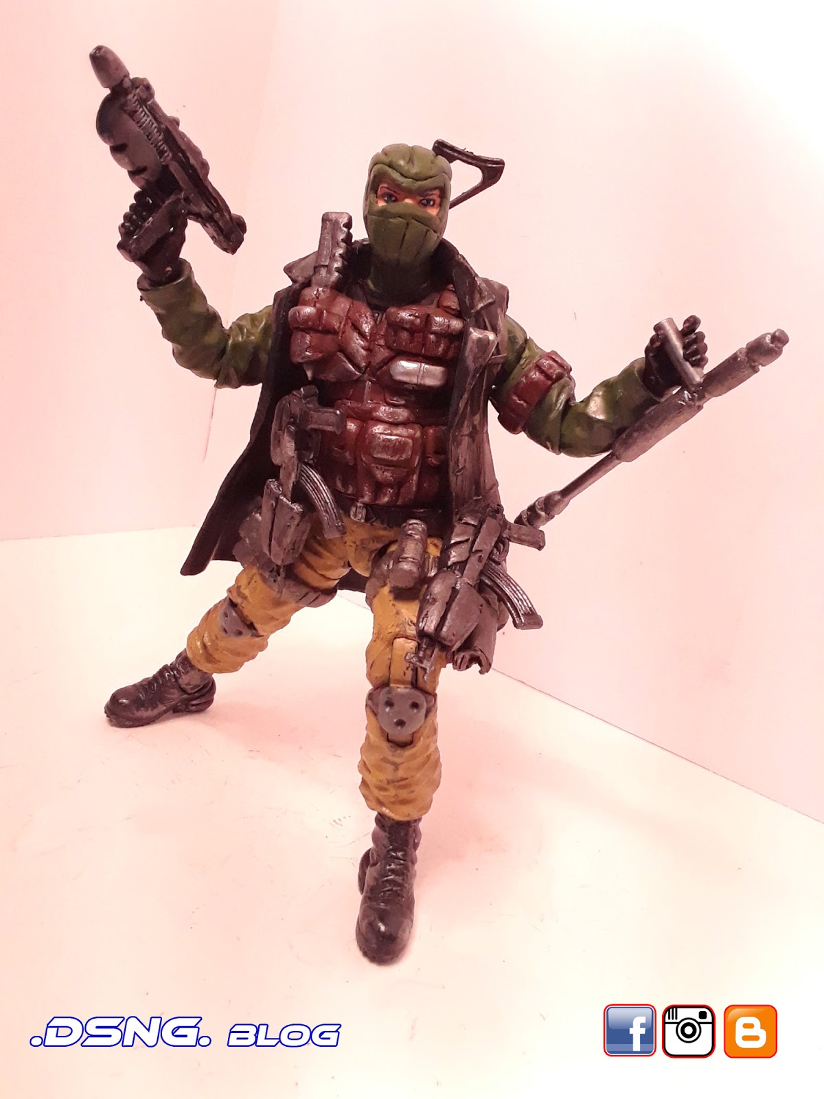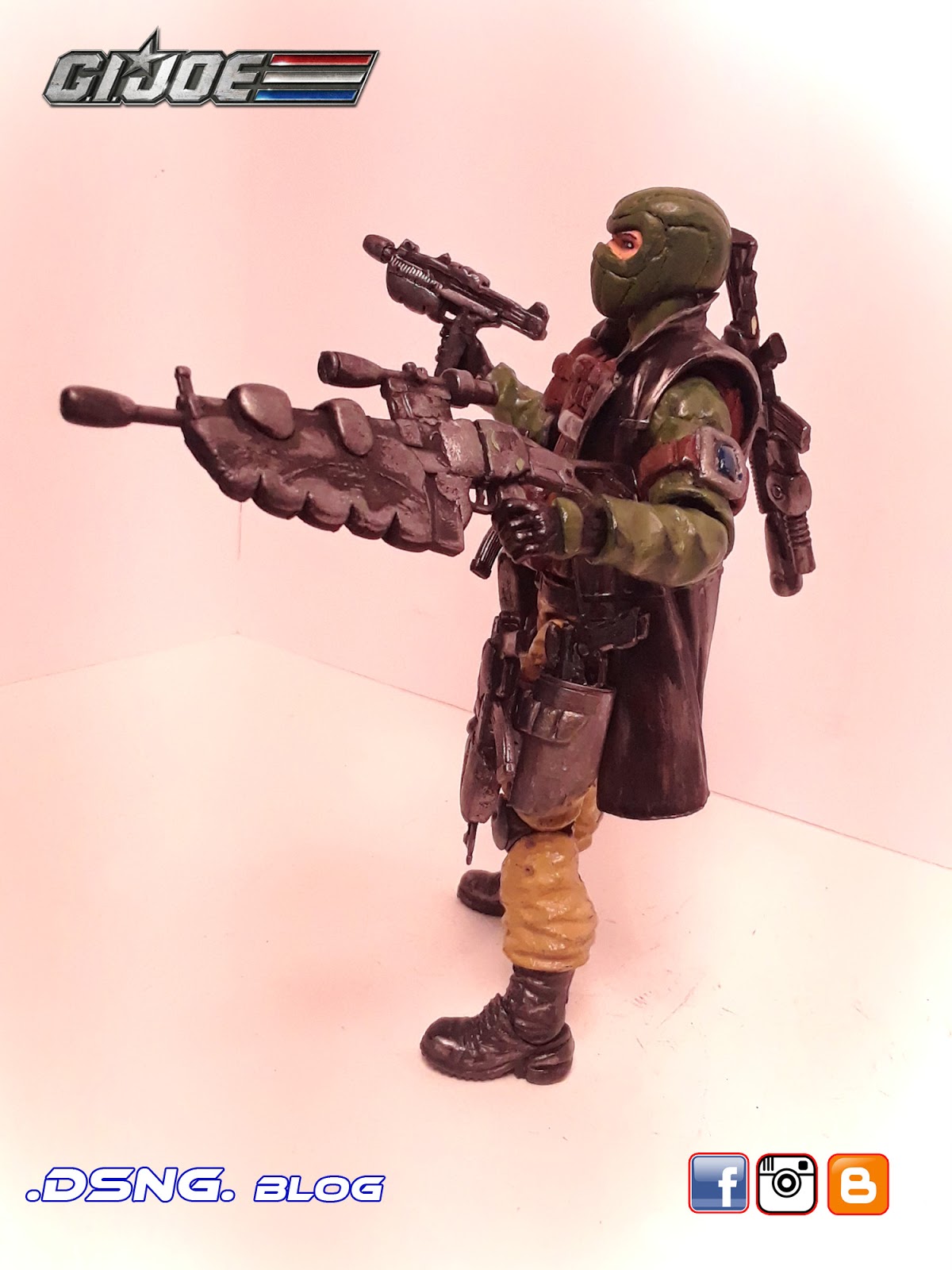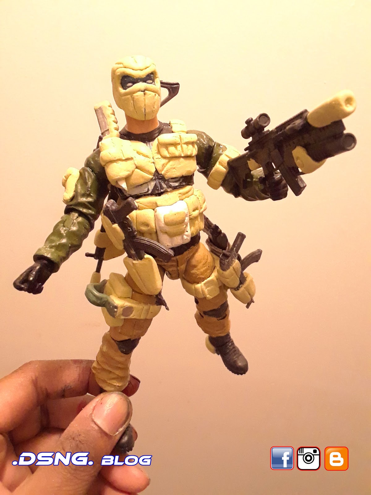 I heavily modified his guns, after buying them on ebay. And the jacket came from Punisher. And some of his guns have magnets that keep them in position. I did sculpt the rear pouches on his back [take a look at the putty / sculpting pics below]. Yet I decided to add the jacket, since it seemed to work with the character... it just gave him more swag LOL. Tamiya paints were used, and he was hand painted. My custom Snake Eyes was added to the mix, and his former gallery is over