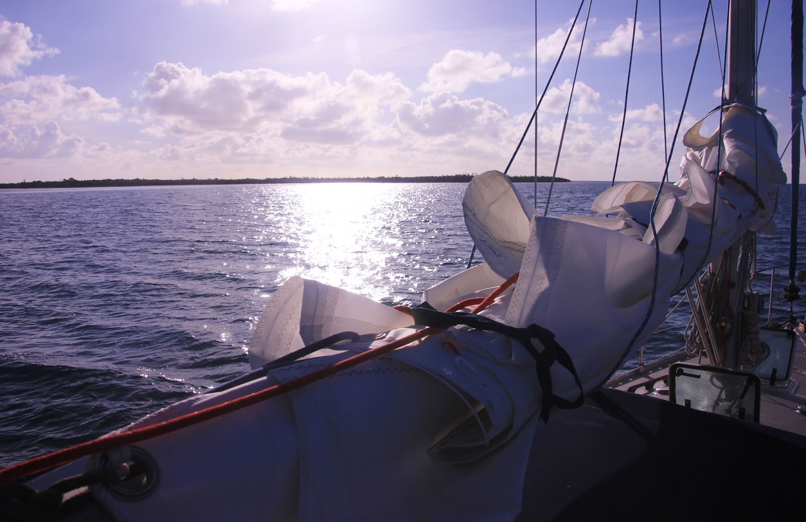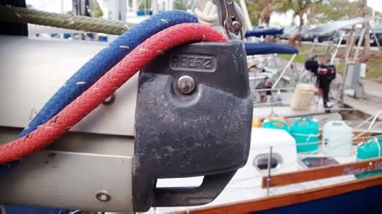 1 - In certain conditions, you need to reef your sails, which involves reducing the amount of sail you have out so that you're not overpowered. For our mainsail, we use reefing lines to fold the sail down on the boom.