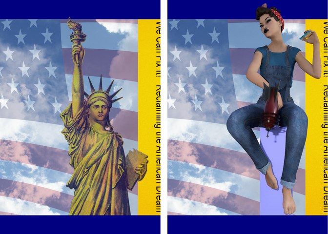 Now that I've launched the eBook, I've begun thinking about the summer release on Amazon and in paperback. I've been working on the back cover. Originally I wanted to do something with the Norman Rockwell version of Rosie the Riveter. But, when you work with 3D models you've got to use what you've got. The real Rosie has a rivet gun across her lap. The fake Rosie has a blowout in her clothing. I posed the retro ray gun to conceal the blowout. However people said it looked rude. So, Rosie stepped out and Ms. Liberty stepped in.