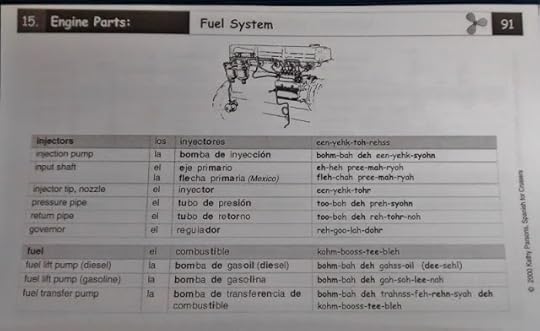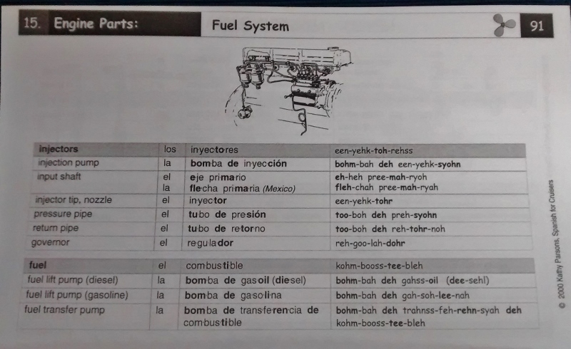 2 - When we bought out sailboat, it came with a handy >>Spanish for Cruisers<< book by Kathy Parsons. It's chock-full of vocabulary and phrases related to boat repair and maintenance. The kind of words that I don't really have an interest in knowing in English, let alone Spanish. Words like >>bomba de inyeccion<< (injection pump).