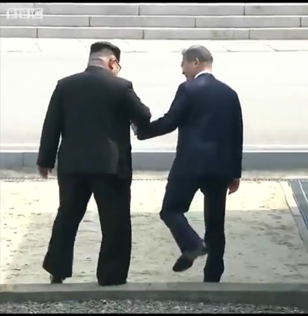 The symbolic crossing of the 38th parallelThe leaders of the Koreas cajoling each otherto cross the coveted line. ©FGThe world is pleased with the symbolic crossing of two brothers, brothers-in-arms, who, for the good 60 over years were hawkishly looking after each other with scorn over the 38th parallel. The arbitrary line set up in a wishy-washy way in 1955 after a feud which was heading nowhere. Instigated by cheering and doomsday prophets from the world over, the siblings spotted tangential growths of gargantuan proportions, so we are made to believe. Bear in mind, the world should not be too complacent that everything would be hunky dory from now on. Remember, the euphoria after the fall of Berlin Wall did not last enough for the world to forget the dark years of the Cold War.