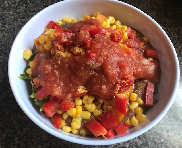 After breakfast, I drove back to Memphis. I made a quick lunch using some leftovers from last week. This Burrito Bowl has fat-free refried beans, quinoa, steamed collards, baked sweet potato, corn, and salsa. Very filling!