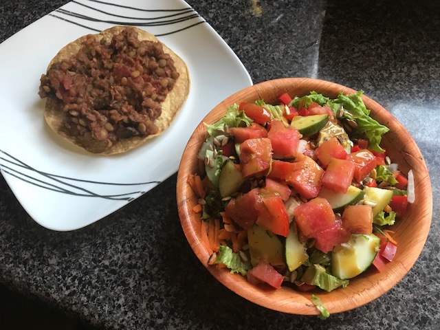 In the afternoon, I snacked on grapes and strawberries. And then for dinner, I heated up leftover Sloppy Joe Tostados, which I made from the Seven-Day Rescue Diet cookbook for Saturday's dinner. I had a salad with oil-free dressing on the side. By the way, I had two tostados, but I couldn't fit both on this plate. So I went back for seconds!