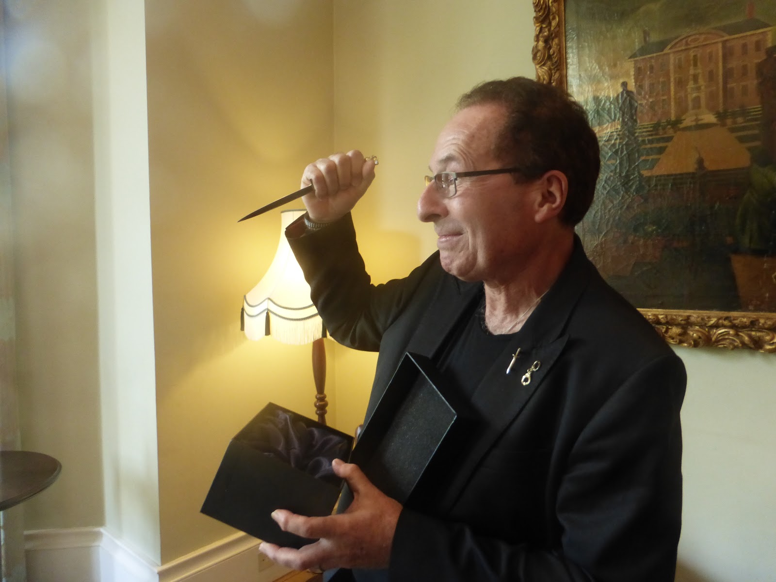 Among many other things, I was delighted to present Peter James with a personal memento recording the award to him (a couple of years ago) of the CWA Diamond Dagger (see him wielding it with great aplomb below!). I also had a highly enjoyable dinner with my publishers, about whom more news before long...All in all, a terrific week-end. The delegates were sorry to hear Adrian Muller announce at the Saturday night banquet that there is some uncertainty about whether CrimeFest will take place next year, but here's hoping...