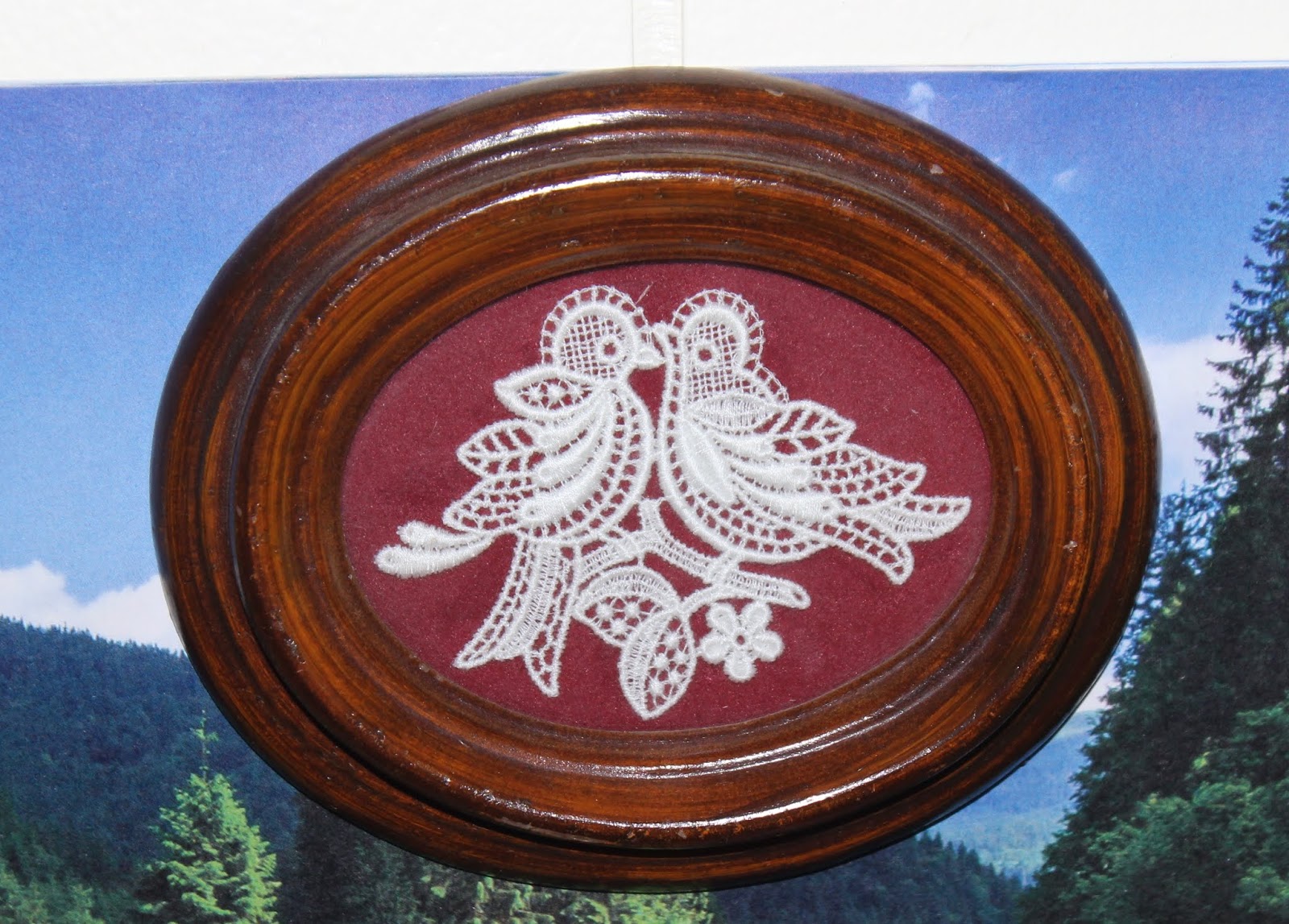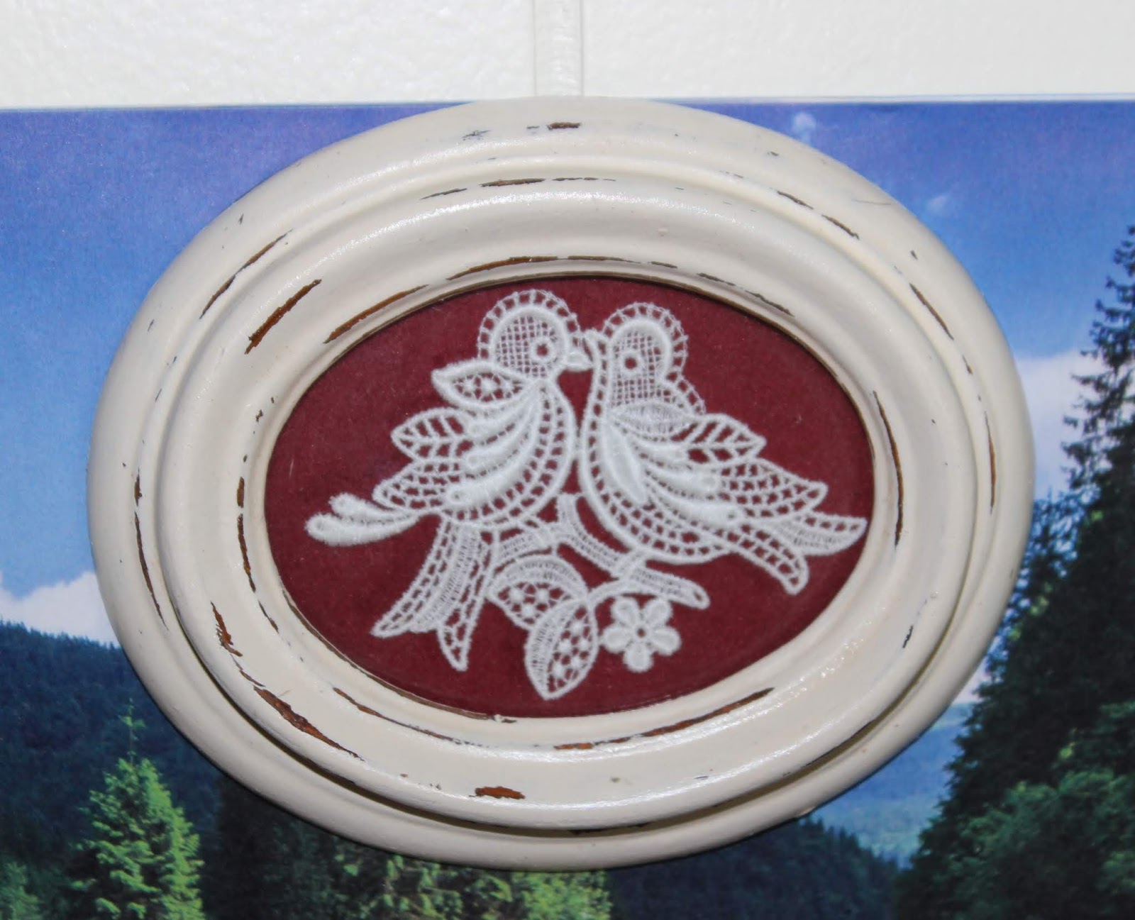 (FYI: This little framed piece of lace in the frame is about 5 inches across -- and it hangs on the nail that supports my calendar.)