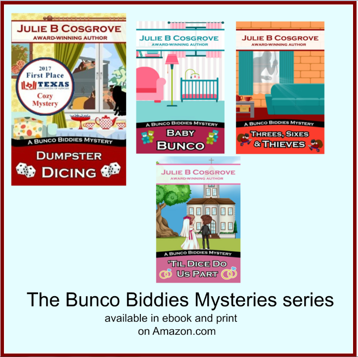 I am on Facebook as juliebcosgrove.tx, and you can also review my Amazon author page.