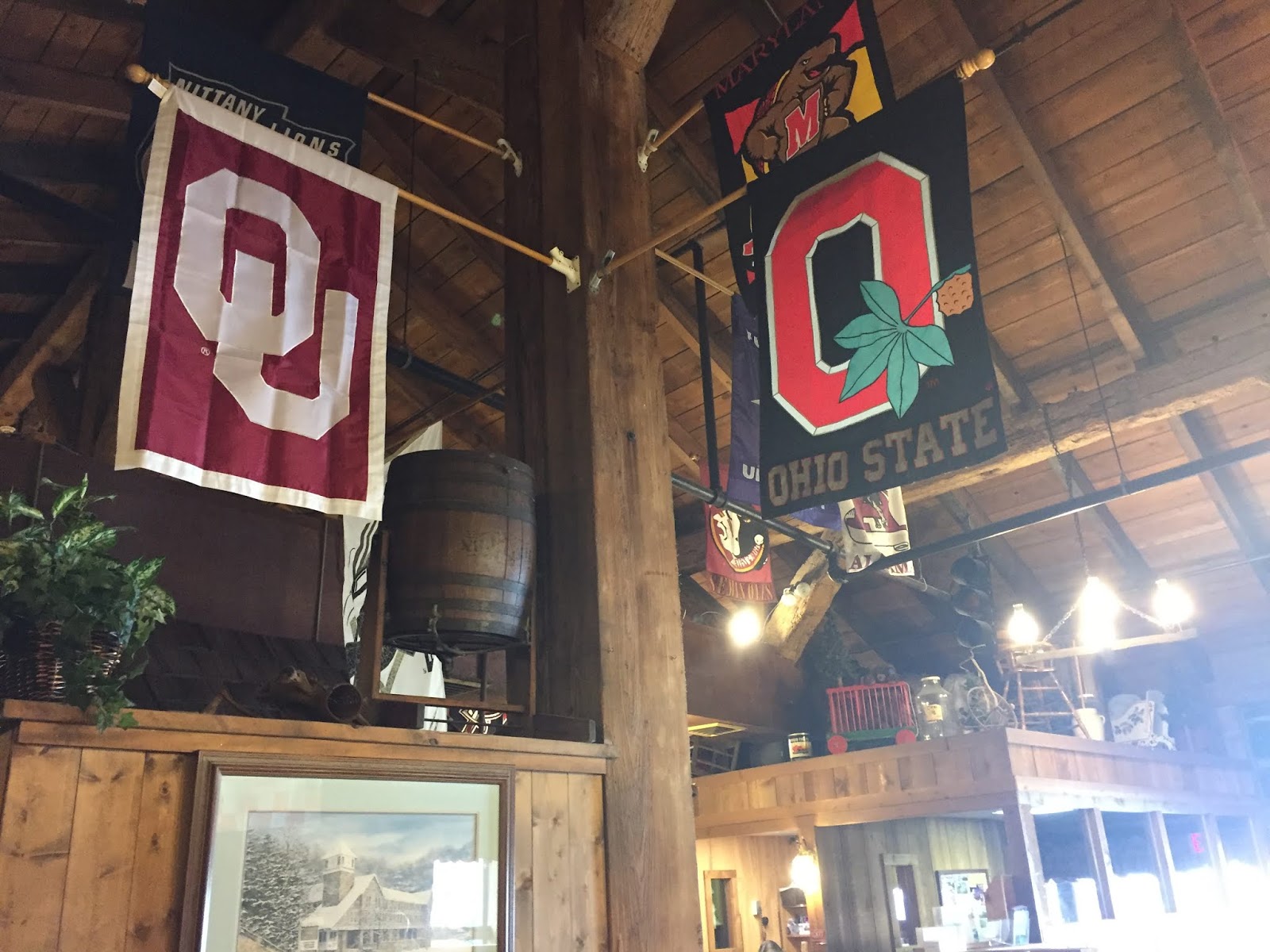 Suspended from the rafters are college flags, about seventy-five total. We looked for the flags of the schools where our daughters attended. Prominently visible from our booth was the flag of The University of Oklahoma.
