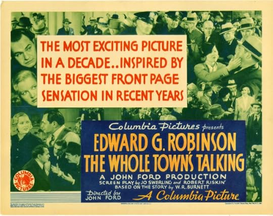 I've come to the realization that Edward G. Robinson is my all-time favorite actor, and movies like this one (which I'd never seen before) are the reason why. Released in 1935, just four years after Robinson became a star playing the brutal, almost feral gangster Rico Bandello in "Little Caesar," this film shows Robinson both playing off that character and revealing that he could play entirely different roles, meek men beaten down by life, the sort that he'd memorably depict in "The Woman in the Window" (review coming in the next post) and "Scarlet Street," two film noirs he made with Fritz Lang a decade later. In this comedy/drama, Robinson plays both notorious gangster "Killer" Manion and Arthur Ferguson Jones, a shy bank clerk who has the misfortune to be Manion's spitting image. Sure, it's a hokey plot and the machinations to keep things going get pretty outrageous, but where "The Whole Town's Talking" really succeeds is as a showcase for Robinson. He makes Manion and Jones seem like two genuinely different people, with Jones growing braver and Manion more desperate as the film continues. With some surprisingly convincing split-screen work (especially for 1935) it's easy to forget you're watching one guy and not two. The great Jean Arthur plays the shrewd co-worker who falls for Jones (despite the fact that he stole her photo and hangs it next to his bed ... yikes!) and the whole thing is directed by none other than John Ford, a few years before he'd make John Wayne (and himself) a screen legend with "Stagecoach."