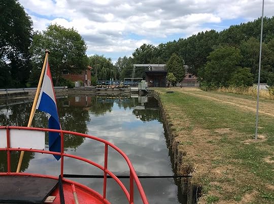 Anyhow, since last Sunday (that means ten days ago, not three), we have completed our trip up the Dender and the Blaton-Ath Canal. What a lovely waterway it is. Imtimate and very pretty. What amazed us, however, was the difference when we crossed the language border into Wallonia. On the one hand, the service stepped up a couple of notches: we had a whole team of lock assistants helping us through, all with uniform T shirts although the French being thus, they each had their own style. On the other, we had the waterway virtually to ourselves. Gone was the struggle to find a mooring and we had perfect spots in both Chièvres (Lock 15) and Ath, complete with electricity and water, and at the former there was even a shower. We paid just €5 for the night there and nothing at Ath as the Capitainerie was not open, so our lock keeper, whom I dubbed Gerard (he was a shoe-in for Gerard Depardieu if ever I saw one) shrugged and smiled and that was that. On the subject of Gerard, he really was a character and told us with great pride about his beautiful Russian wife who could speak 5 languages and was a complete Francophile. When he first met her, he was bowled over to find she knew more about his history and culture than he did. A lock keeper with a difference for sure. One of the other lock keepers on the Blaton-Ath section sported a ponytail and blue-lensed mirror glasses, while his colleague wore a straw Fedora and had a cigarette perpetually hanging from his lips as he zoomed between the locks on a moped. As I said, their own style. We spent the last night on the canal in the penultimate lock, whose gate refused to close. By 8:15 the next morning, it was fixed by the official electrician who probably just flicked a switch, officially of course, and off we went down the last two locks. I must say, the locks on the whole canal were easy for us. Very regular and not too tumultuous. I liked that.