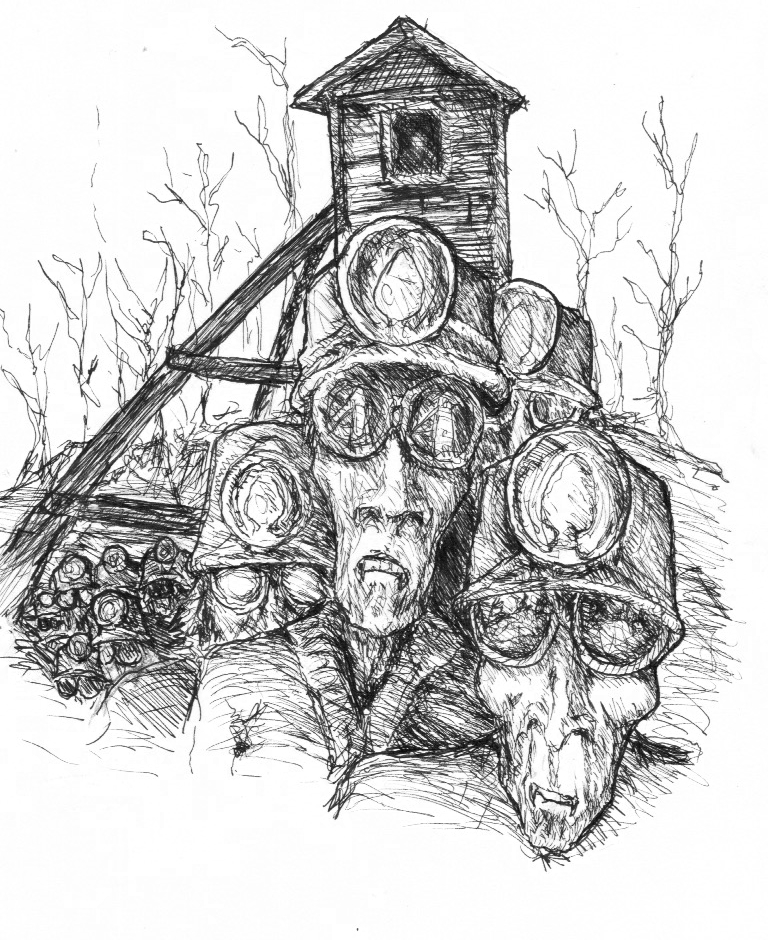 I cannot say too much about the surprise, other than to say that this pen-and-ink drawing has a relationship to "The Pit-Heads," a story of mine that you can read for free over at The Devil's Exercise Yard website (