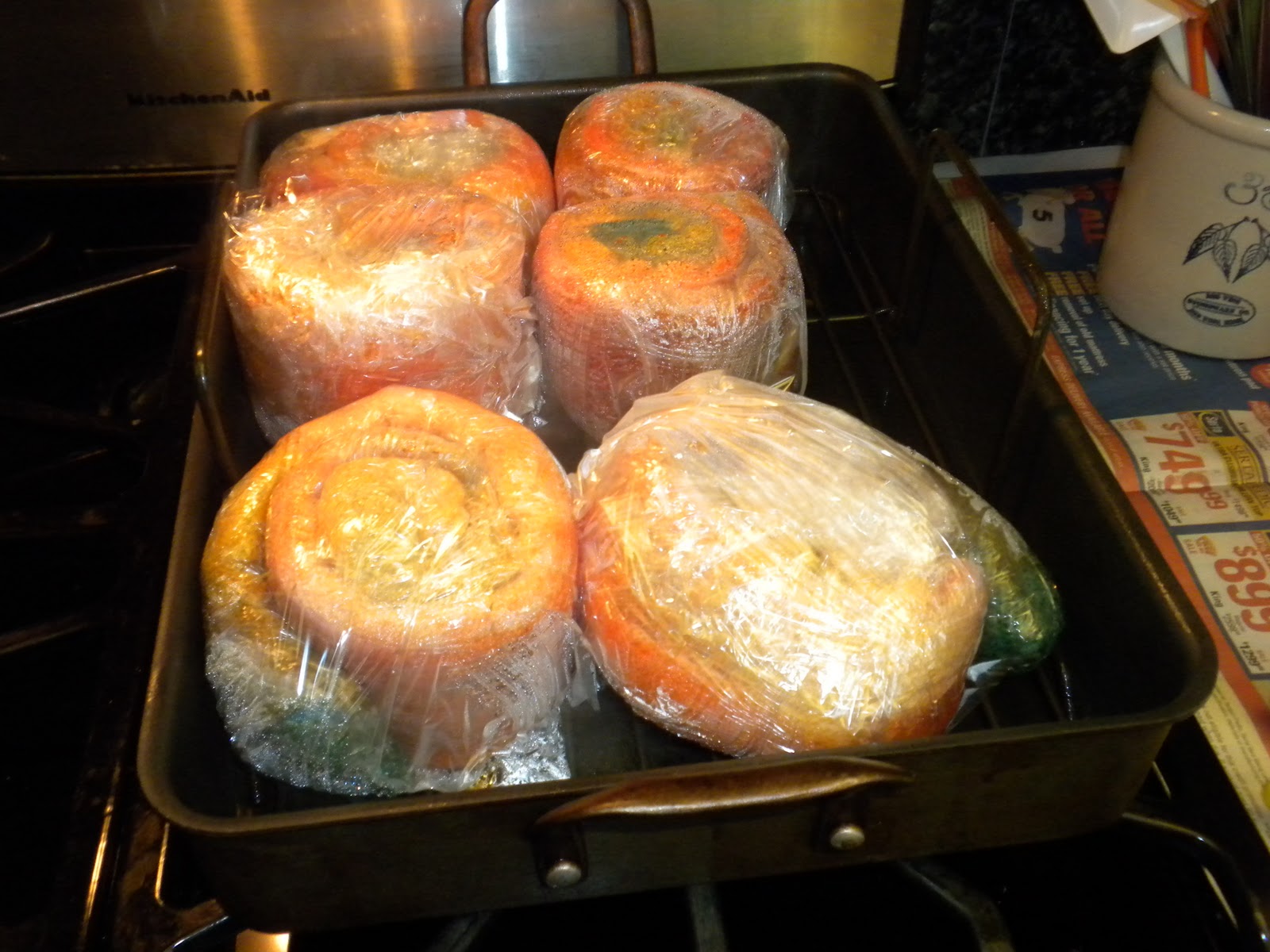 We flipped the yarn over, did the other side if needed, then rolled the skeins up like caramel rolls in plastic wrap and cooked them on the stove for awhile. (This is how the color sets.)