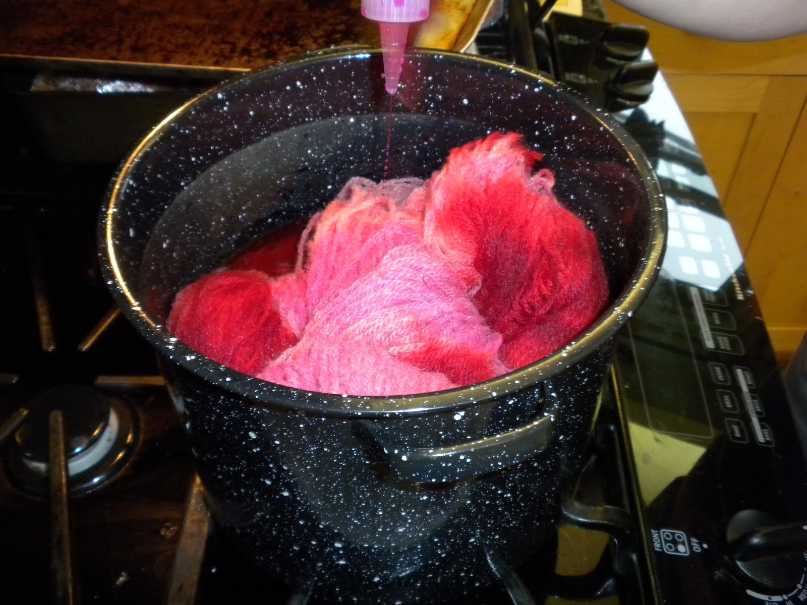 The second method was to put dye in the bottom of a pot, add the skeins, then squirt/pour more dye over the top.