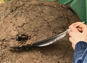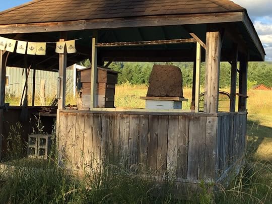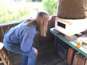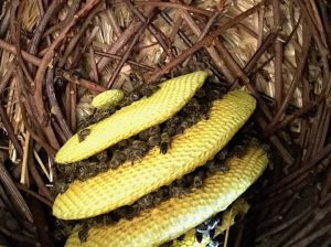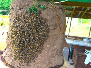Recently I wrote about the hive I built from sticks, clay, sand and cow manure. The mud hive sits on the right side of the bee gazebo. Soon after I placed it there, I collected a swarm from my friend Anna’s bees and invited them to move in with us.