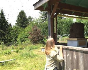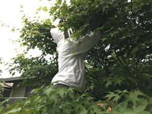 So Anna’s hive swarmed and I went over and picked them up. Here I am in the tree collecting them.