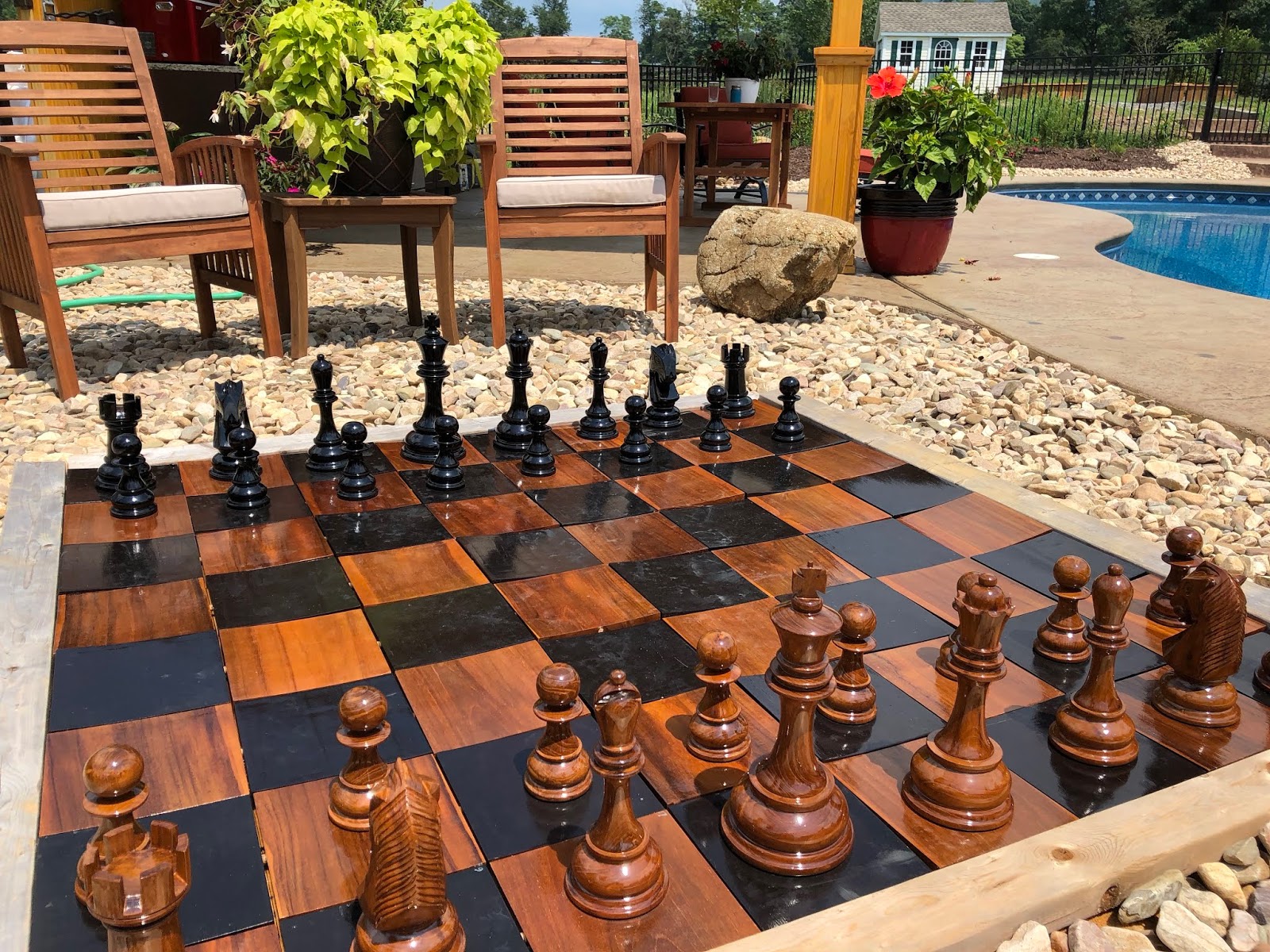 A giant lawn chess board provides a little intellectual stimulation while cooling off at the pool.