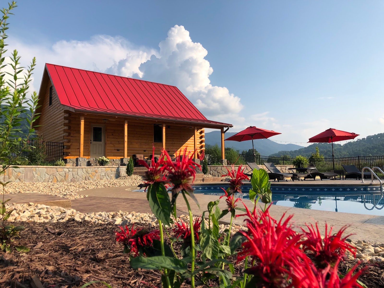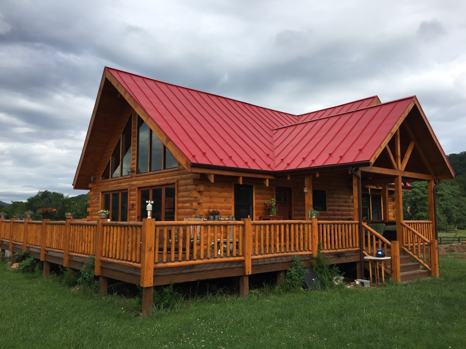 Front view of the cabin with the "carriage house" (aka the garage, workshop, and Robin's office) to the left.