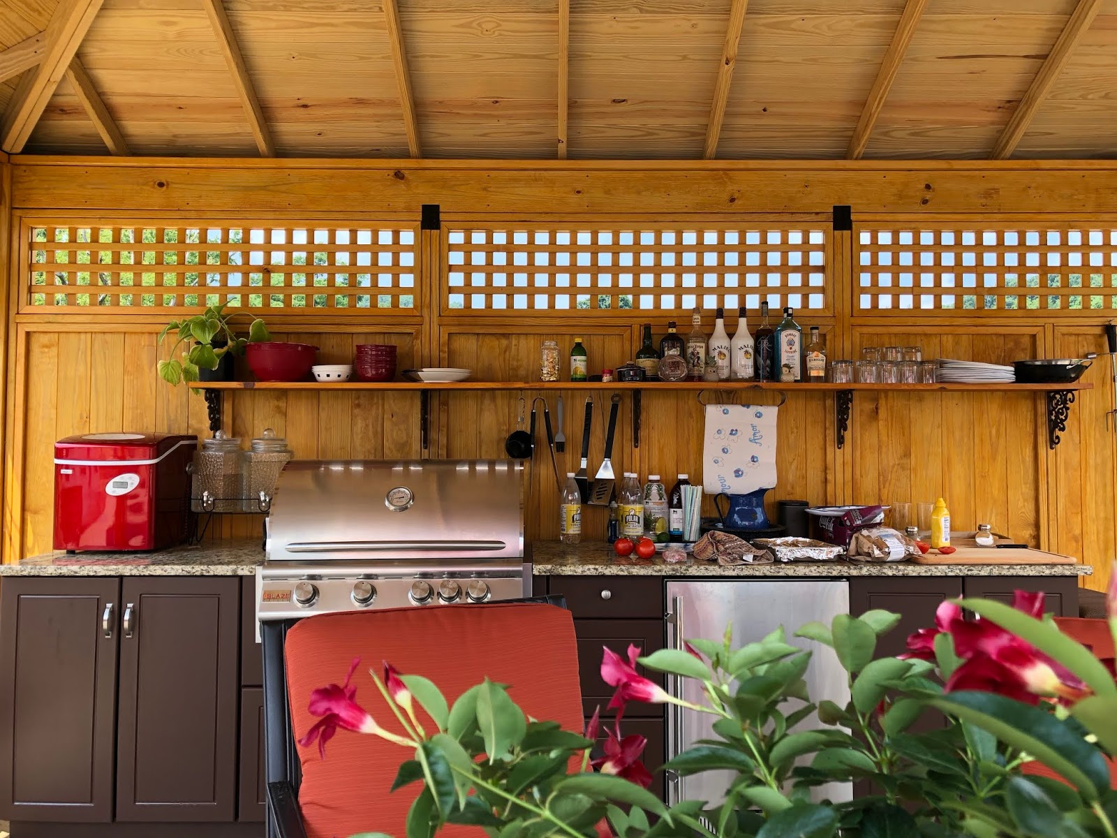 The outdoor kitchen is nestled under the pavilion and has granite countertops and weather resistant cabinets. It features a huge grill, refrigerator, and ice maker for mixed drinks.