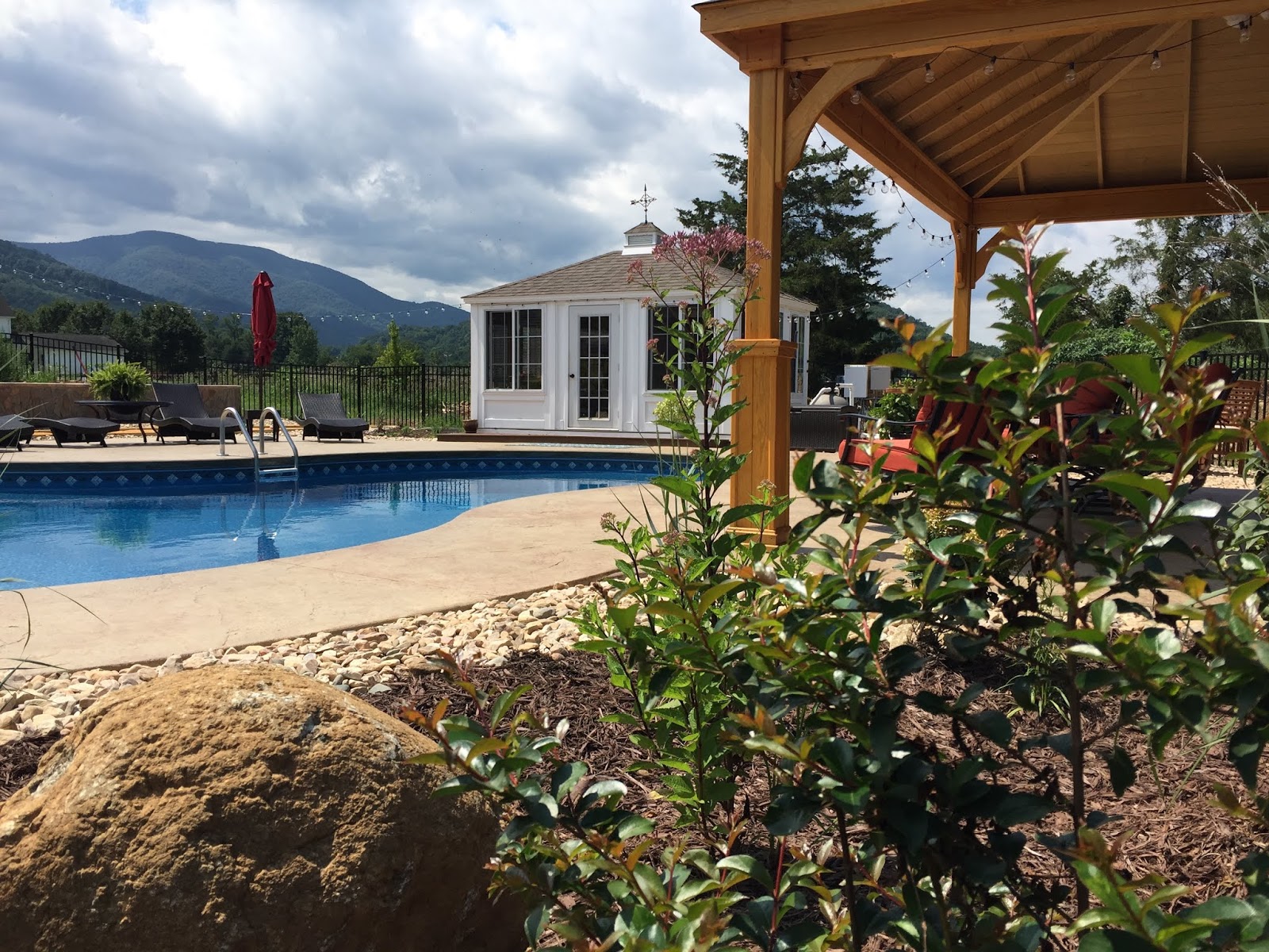 New this spring, the pool area! It consists of a pool house, an outdoor kitchen, a sitting area under the back porch of the carriage house and some places for fun and games.