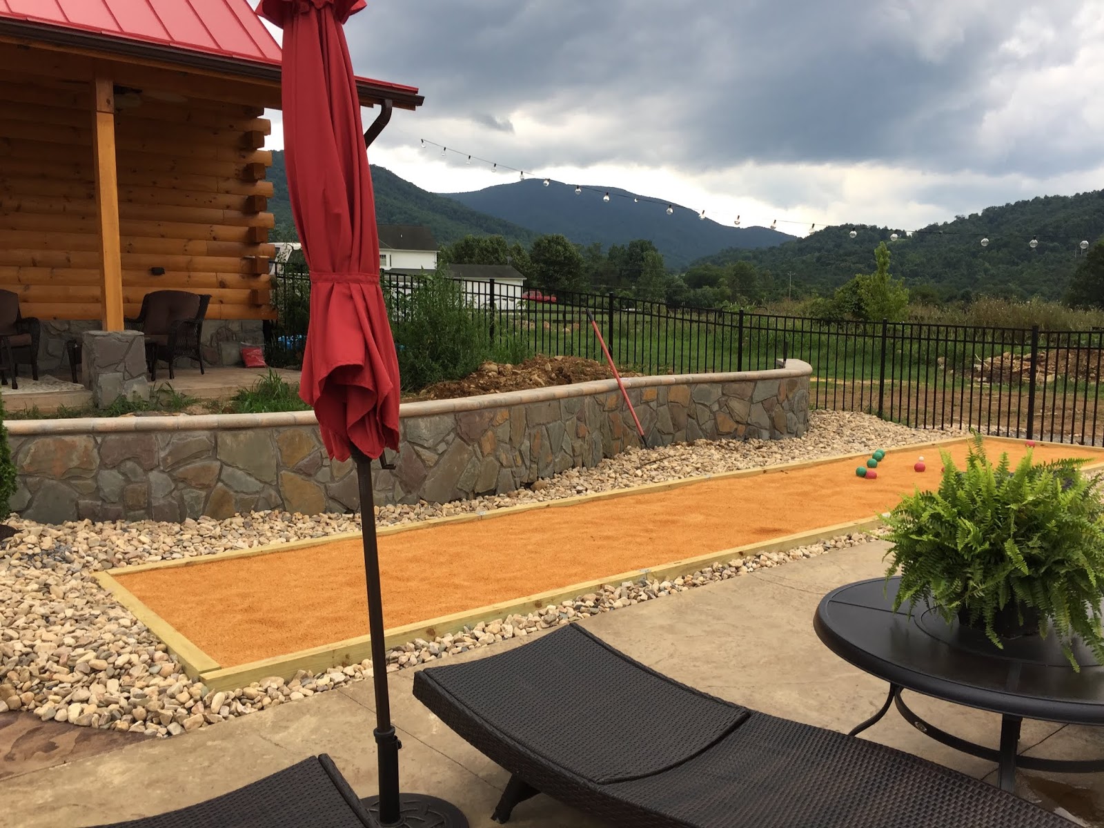 The bocce ball court is sandwiched neatly between the pool and the back-porch sitting area.