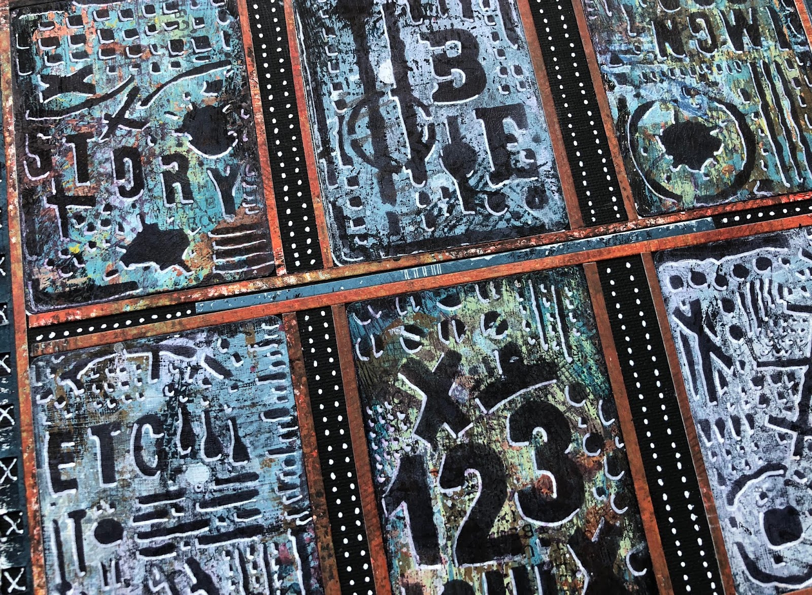 See my original three stencil releases that fill a full 9" x 12" stencil with grungy goodness.