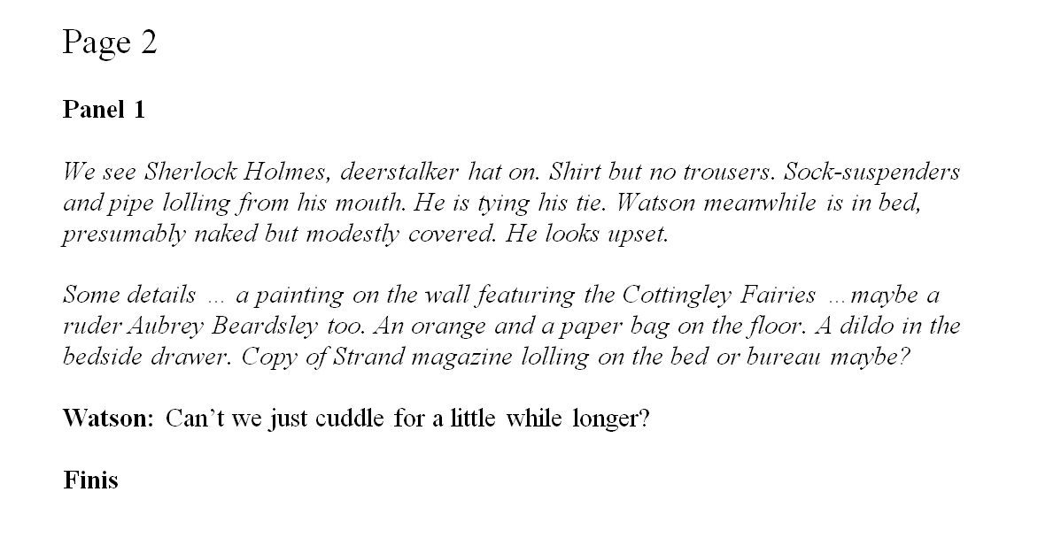 I was reminded of it today as I was rooting through some files on an external hard drive and found the script. To my delight it featured this panel description: