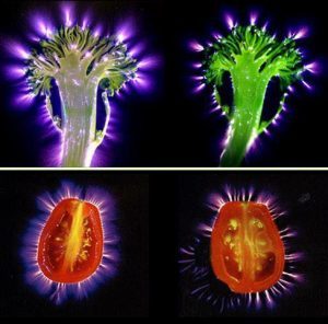 When you ascend from second density your first incarnation in third density will rely heavily upon the programmed behaviors that will help you function in the new body. You are used to consuming matter to provide the required energy for your vehicle and you will continue to do what you are used to doing. However, as you grow in consciousness through repeated incarnations you begin to understand that ‘what’ you eat is more important than ‘how much’ you consume. Everything you consume to fuel your body has at one time been alive and the consumption of this material is providing you with creational energy as well as physical nutrition. The picture associated with this post shows the life force emanating from a stalk of broccoli and a tomato. The larger energy spectrum is coming from the raw vegetable and the reduced spectrum is a result of a two minute steaming to cook the food.