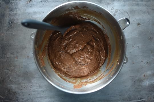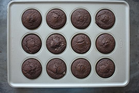 Add the dry ingredients one-third at a time, until they are completely incorporated and the batter looks like glossy milk chocolate pudding. Line a 12 cup muffin pan with paper liners or butter it well. Carefully divide the batter evenly between the 12 muffins.