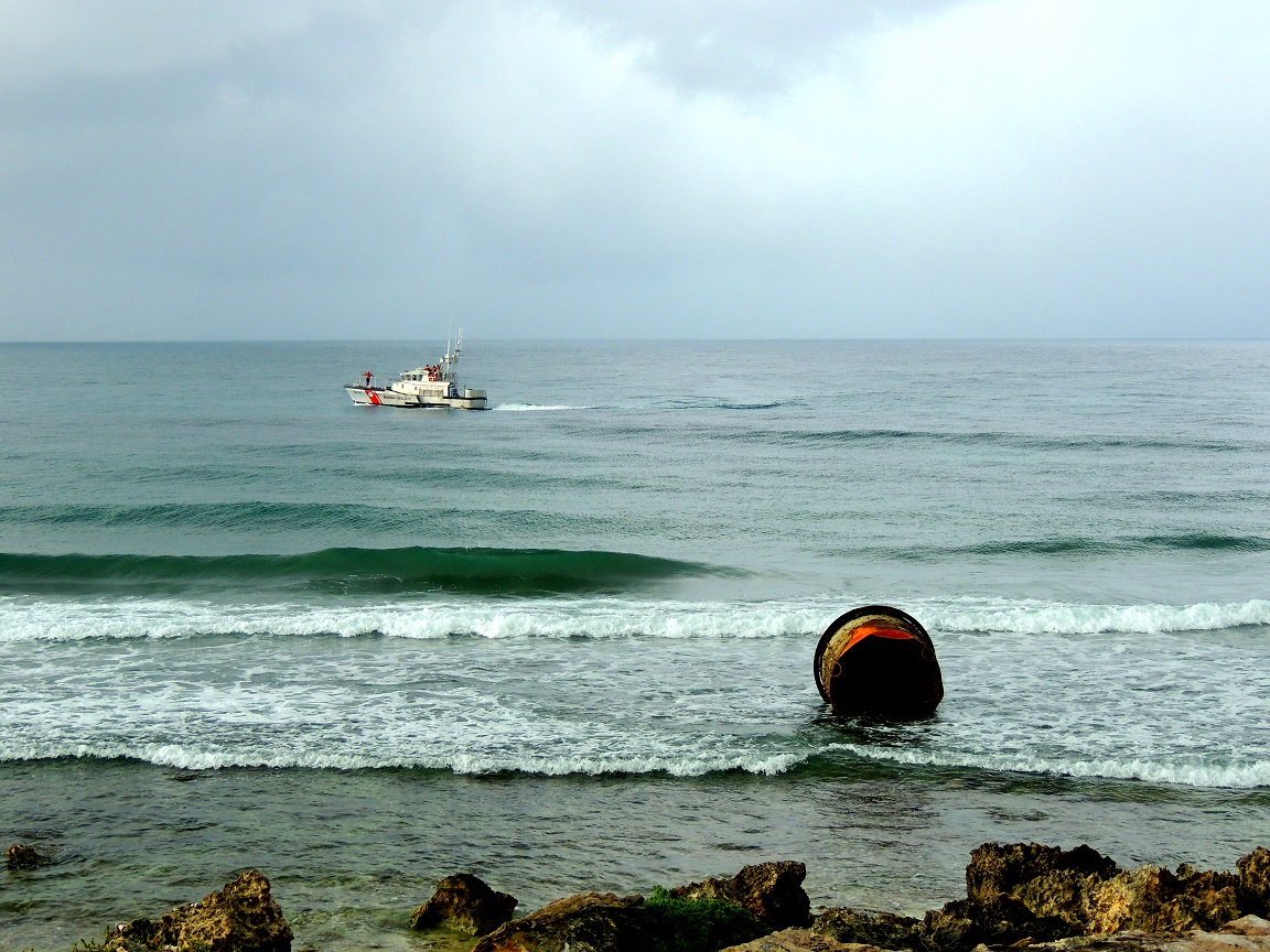 Then the sleek navy cutter arrived cruising back and forth in the deep water on the other side of the reef, unable to hook a line on the buoy due to the increased size of the waves, and the shallow water inside the reef.