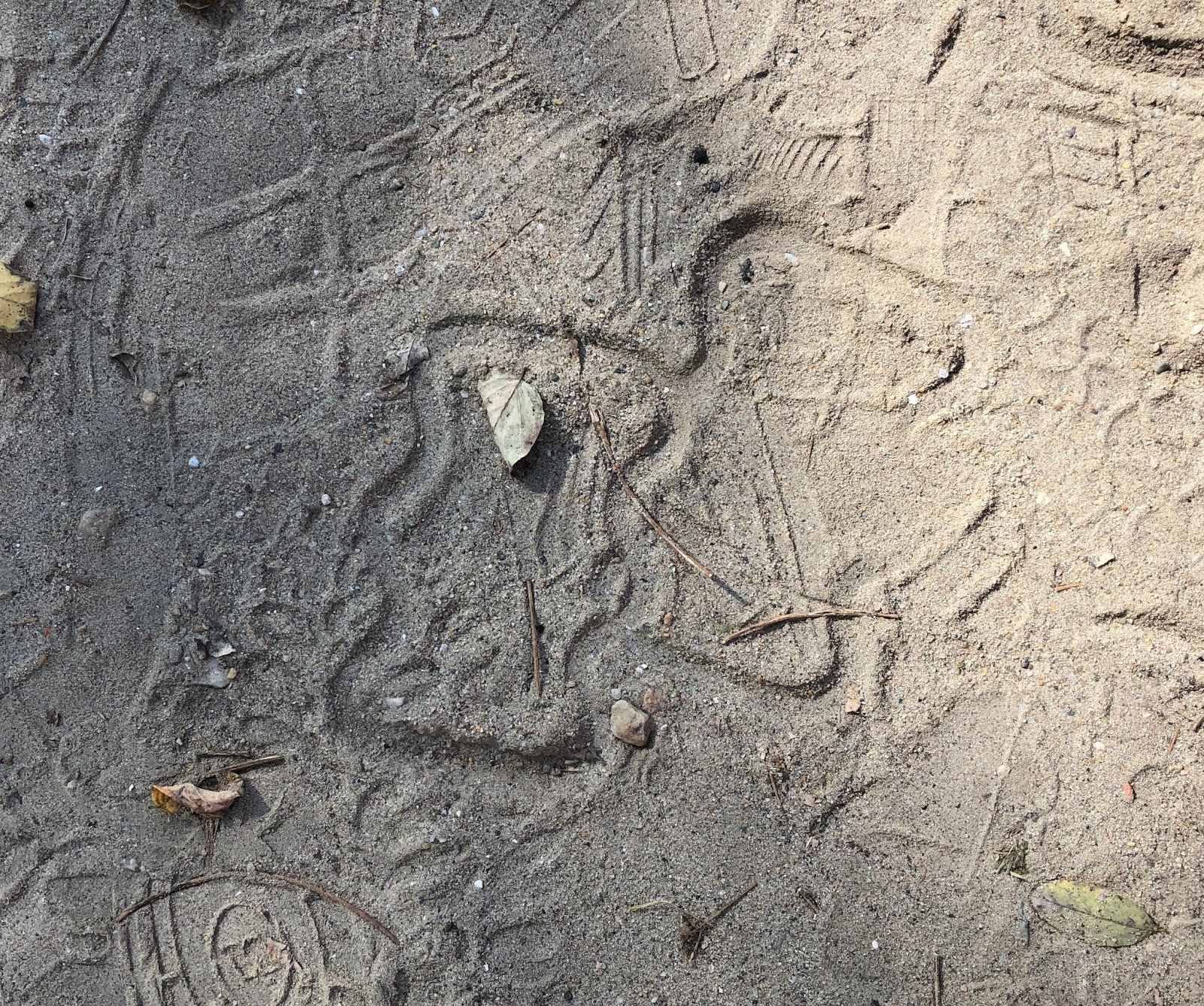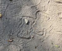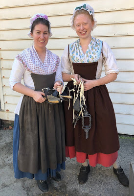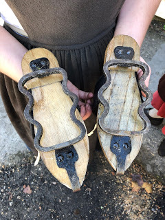 The photos here show Jenny (in the blue petticoat) and Aislinn (in the red petticoat) holding the various components to the pattens, as well as close-ups of the soles and rings, and the pattens both on and off the foot. Perhaps my favorite photo is lower right, with the distinctive marks left by the patten-rings mingling with the modern sneaker-treads of CW visitors. The video, below, shows Jenny walking in them.