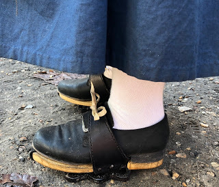But as Jenny Lynn actually wore the pattens, she discovered a number of things that scholars hadn't realized. First of all, walking in pattens is an acquired skill. Jenny likens it to walking in high-heeled mules. Because there's no back-strap, the wearer's weight must push forward onto the ball of the foot, or she'll walk right out of the soles. An 18thc woman who wore pattens regularly would have been familiar with how best to walk in them, but a certain amount of shuffling must have been unavoidable.