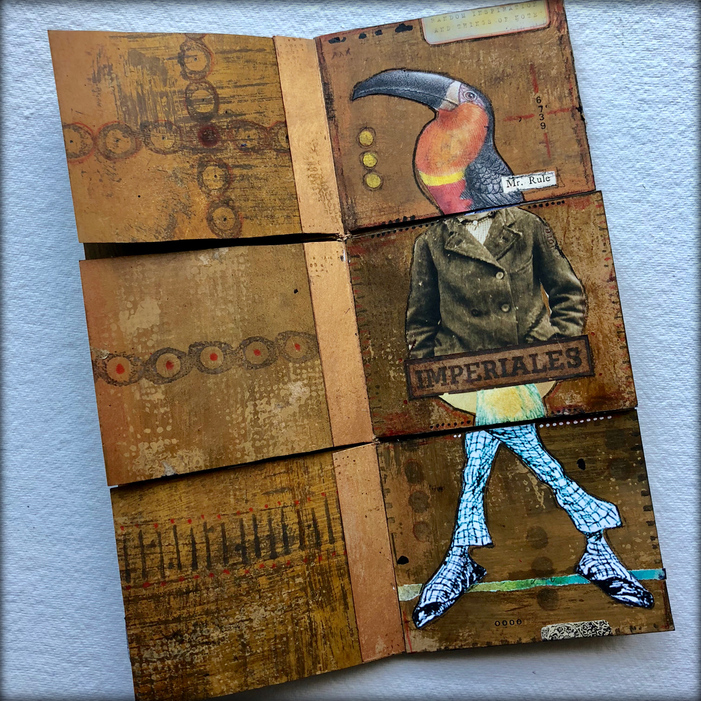 The cover includes layers of collage, acrylic paint, ink and Vintage Beeswax Baked Texture, which gives it a faux encaustic and almost leather-like look.