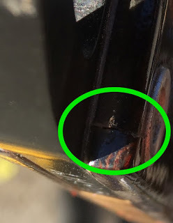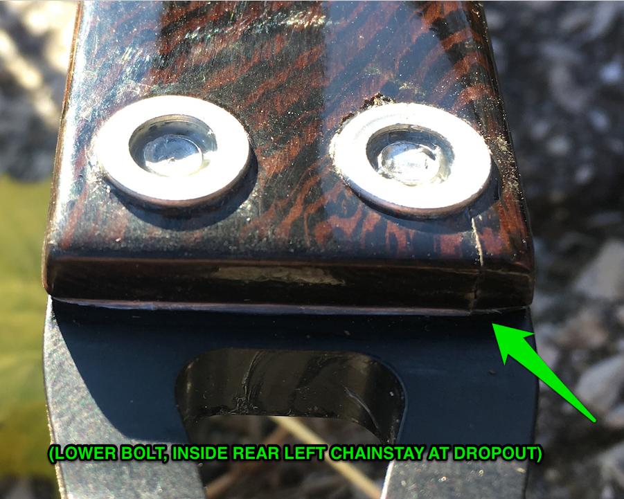 Yes, I realize it's in shadow, but what you're looking at is a split in the wood where the left chainstay is bolted and bonded to the rear dropout. Remember how I said early on I found some cosmetic cracks in the bike? Well that's one of them, and here's what it looked like back in November 2017 when I first discovered it: