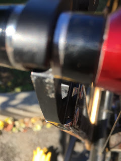 It's a lot easier to inspect a bike under the brilliant rays of the autumn sun than it is under the energy-saving lighting fixtures in my basement, so that's what I did. And here's what I fixated on:
