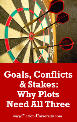 By Janice Hardy, @Janice_Hardy This week's Refresher Friday revisits and heavily updates one of my most-referenced articles--the trio of goals--conflicts--stakes. Goal - Conflict - Stakes. They're the Holy Trinity of plotting. They're the pieces that make up every scene and every plot in a novel, and without them, you're likely to find yourself lost in the literary woods trying to figure out what to do or where the story goes.