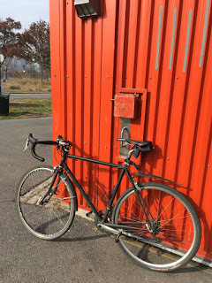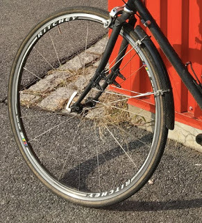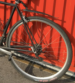 The upshot of all this is that I'm now palping a mismatched pair of wheels, a mismatched pair of "fenders" (if you can even call them that), and a shocking 7mm width differential between my front and rear tires--all this in addition to handlebar tape that is in tatters and a front derailleur I recently had to bend back into shape in order to attain halfway decent front shifting. Moreover, I don't see myself rectifying any of this in the near future, because after dropping the car off I did go for a ride, and you know what? It was fine.