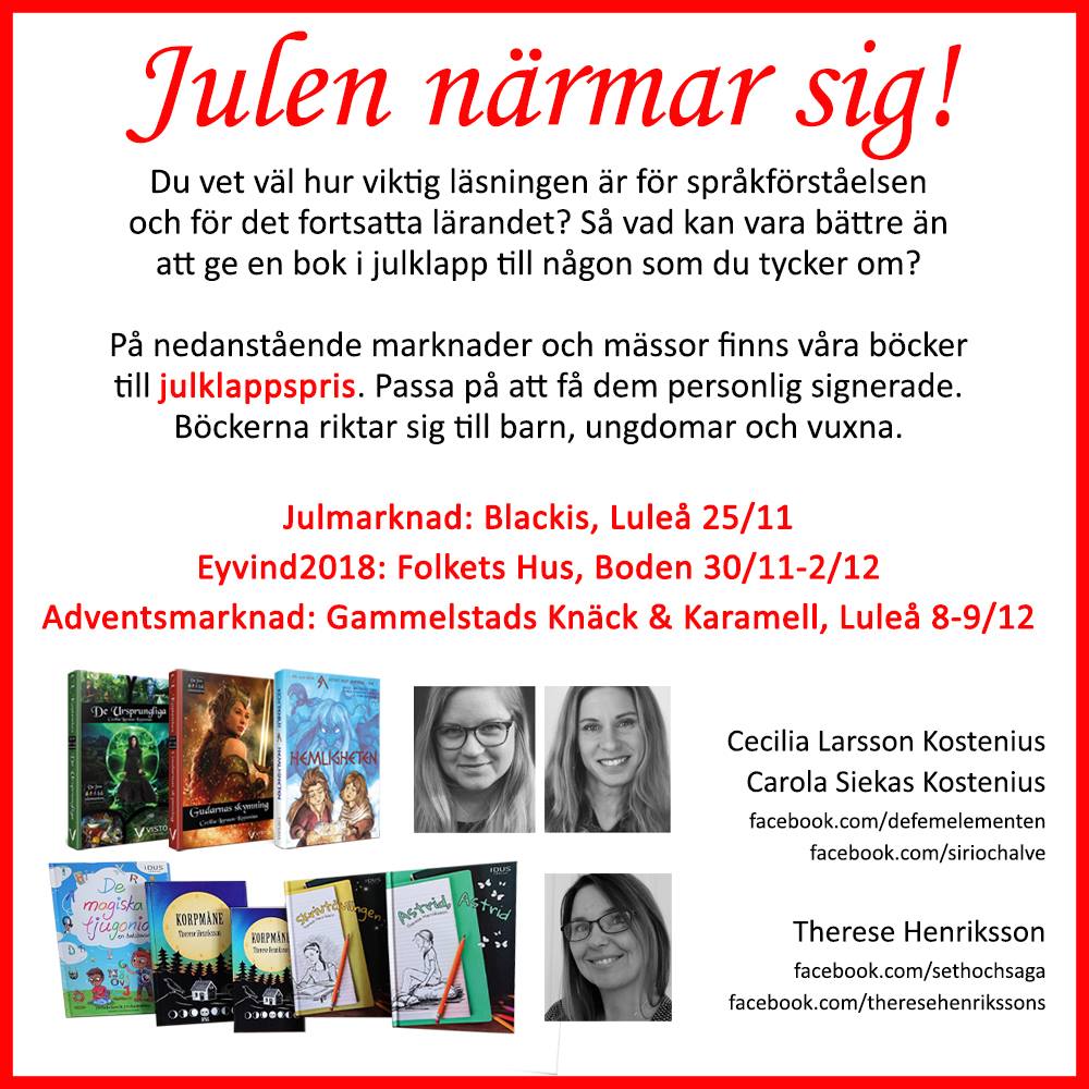 Nu är det dags att ge sig ut med böcker och bilder på julmarknader, mässor och signeringar inför julen. Cecilia Larsson Kostenius och jag har kommit på att det är roligare att vara två. Vi hjälps åt att guida kunderna att hitta rätt bland vårt gemensamma utbud. Kul!Hittills har vi hunnit med att vara på en rad olika signeringar, och nu blir den första för säsongen julmarknaden på Blackis i Luleå till helgen. Jag kommer att ha med mig böckerna "Skrivtävlingen", "Astrid, Astrid" och "Korpmåne" plus lite tavlor och handmålade kort. Cecilia har med sig sina böcker om de fem elementen. "De ursprungliga" och "Gudarnas skymning," samt nya boken om Siri och Alve som hon skrivit tillsammans med sin syster Carola Siekas Kostenius. Nästa helg är det dags för författar och berättardagarna Eyvind 2018 och då blir det bokbord i Boden. Jag ska berätta mer om det när det närmar sig.